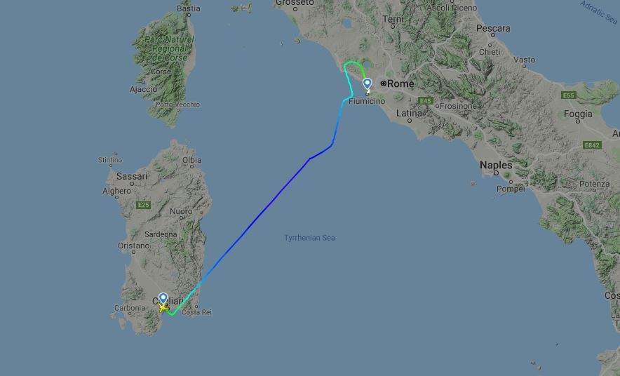 Subito dopo il decollo l'aereo vira a sinistra, quindi sorvoliamo la parte sud-orientale della Sardegna per poi portarci sopra il Mare Tirreno e puntare direttamente verso Roma, che raggiungiamo in circa 45 minuti.