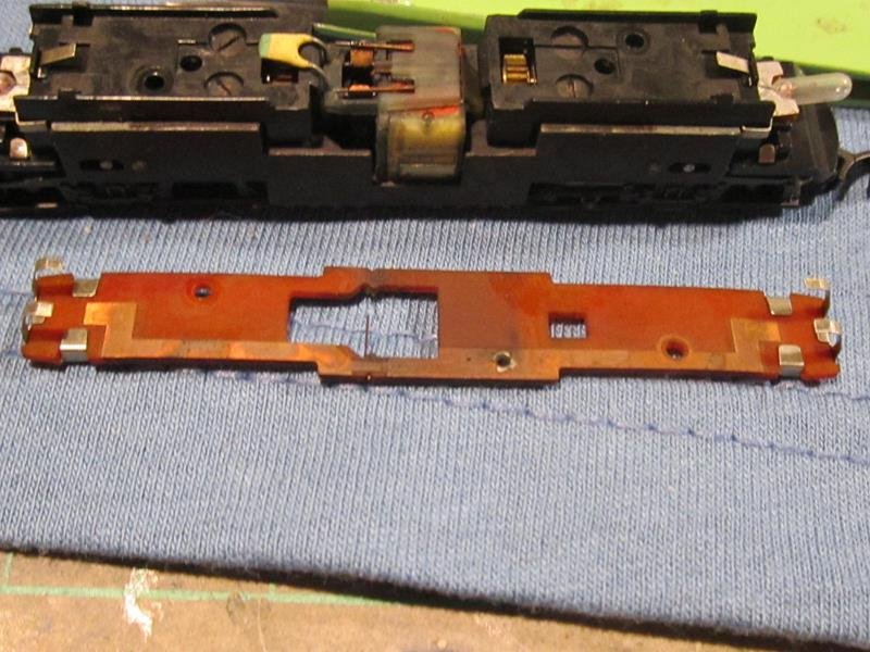 Dopo separato cassa e telaio ( per spiegazioni complete sulla separazione di questi elementi vi rimando a un altro post più esaustivo http://www.scalatt.it/forum/viewtopic.php?f=146&t=16294 ) segno come riferimento il lato destro del telaio e relativo carrello per non invertirli. Al primo esame visivo del telaio si vede che la V200 non è mai stata aperta, i residui di carboncino e sporco sono notevoli tanto da ricoprire tutto il telaio