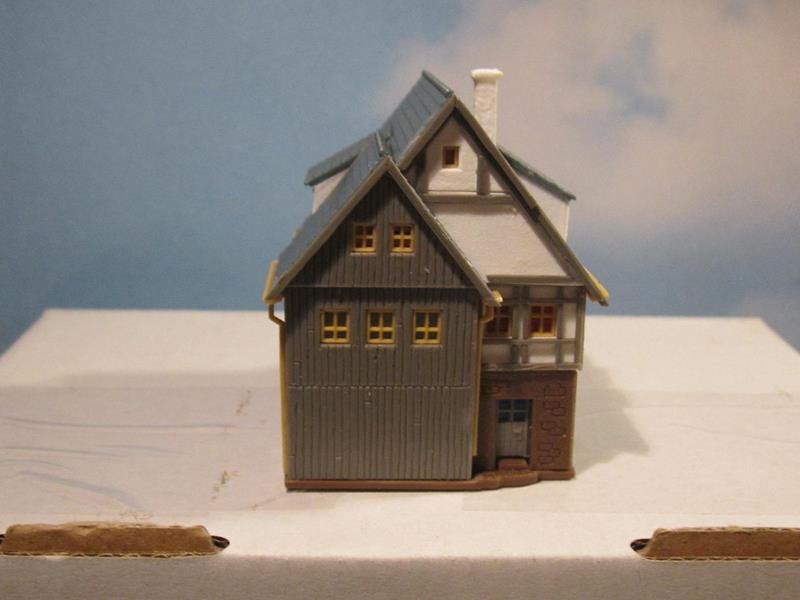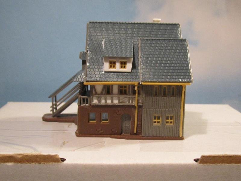 La scelta del fabbricato è ricaduto sul kit Vollmer n° 9547 , una riproduzione di Weinhandlung ( enoteca/fiaschetteria ) che ben si sposa con i moduli vigna, la qualità estetica dei prodotti Vollmer è alta compensando le fatiche di assemblaggio causate sia dal tipo di stampo/plastiche un po datate oltre a una complessità dei sub assemblaggi . Questo kit fa parte di una serie di fabbricati che partono da una base comune per poi diversificarsi grazie ai vari particolari aggiunti, il che comporta un continuo consultare le istruzioni per assemblare i pezzi.