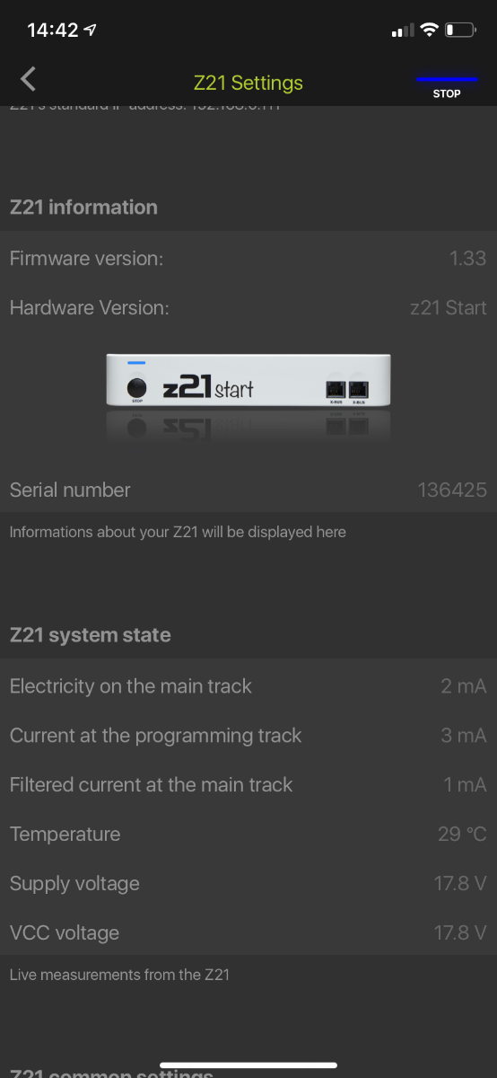 Dalle impostazioni dell'App noto che posso vedere in live lo stato delle connessioni: "Elettricity on the main track" dà un valore che varia continuamente dagli 0 ai 3 mA, decisamente poco (?).
