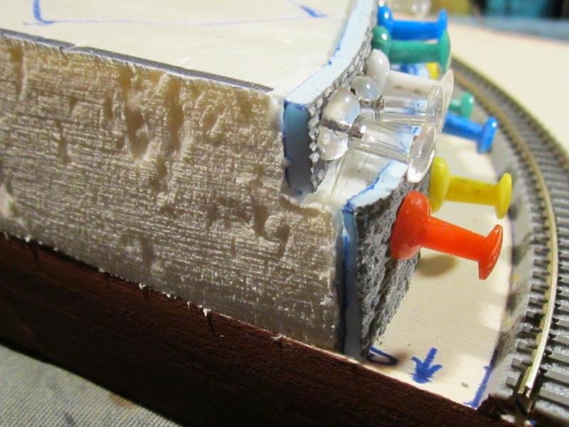 Per incollare il redutex Faller del muraglione utilizzo il comune vinavil aiutandomi con delle puntine a piolo un po più comode perché oltre ad afferrarsi meglio non lasciano lo stampino ( può capitare con queste se si preme troppo ), inoltre il piccolo foro permette di simulare gli scarichi idrici che vediamo su queste pareti.