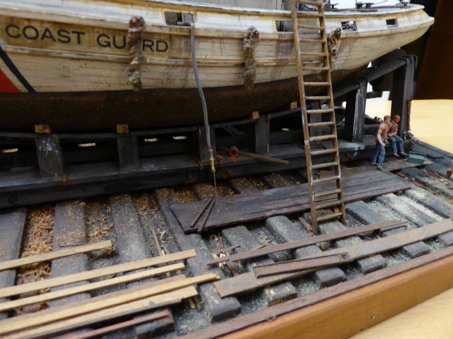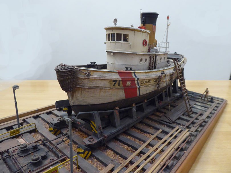 Correvano i miei tempi d'oro del plastimodellismo, più precisamente il 1994, sembra ieri...in cui ero socio sostenitore dell' I.P.M.S ( International Plastic Modeller Society ) il club di plastimodellismo, sezione di Venezia, purtroppo ora non più esistente :( ; eravamo numerosi, in un ambiente con foderate letteralmente le pareti da kits, una vera goduria per gli occhi, in maggioranza aerei, ne facevo anch'io, ma non mi appassionavano più di tanto ; kits rarissimi, il cui proprietario ne era il presidente ; riviste di qualsiasi genere ne abbondavono finchè si voleva per documentarsi ; egli mi regalò una rarissima scatola di un rimorchiatore, oggi assolutamente introvabile, produzione americana degli anni " 70 ", le cui stampate erano mediocri, richiedevano un immane lavoro per poter ricavarne un modello decente ; fu un regalo graditissimo, i rimorchiatori hanno un fascino particolare per me , ed i kits esistenti sono pochissimi ; mi misi subito al lavoro, però volevo ricavarne una scena molto originale, per cui mi diedi da fare con la documentazione . Si tratta di un tipo di rimorchiatore guardacostiero statunitense in uso negli anni 50, poco diffuso all'epoca, ma di fattura comunque similare a migliaia di esemplari simili. Qui mi sono trovato con un esemplare che richiedeva di sostituire buona parte dei dettagli stampati, molte cose furono gettate via per essere rifatte . La scala è la 1:72, mentre la base misura 39 cm . Ho immaginato quindi una scena di un esemplare in scalo di carenaggio posto su apposita culla a slitta per manutenzione .
