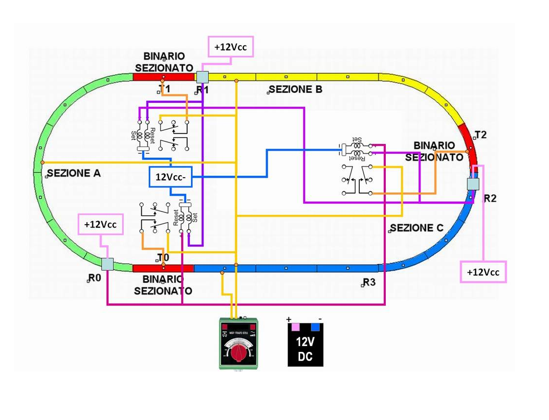La gestione dei binari di stazione implica altri automatismi; nello schema di Tiziano la gestione dei binari di stazione evidentemente avviene manualmente e a vista.