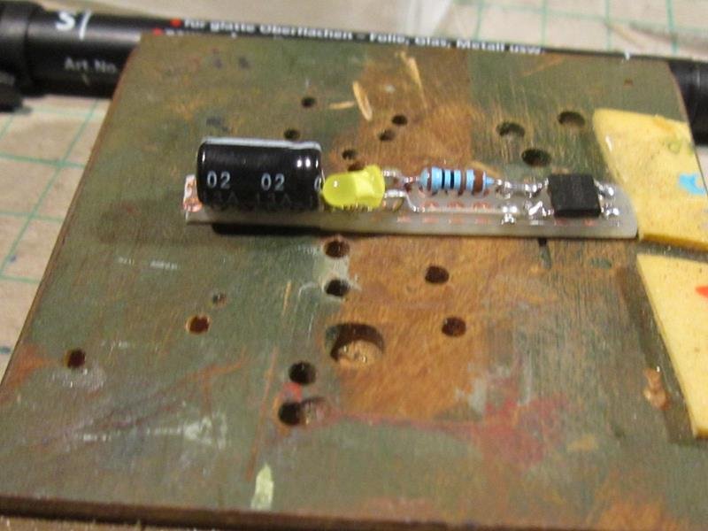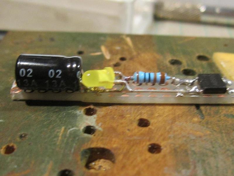 Prendo una striscetta di mille fori della lunghezza e larghezza opportuna per essere inserita sotto il tetto.da un lato saldo il ponte diodi SMD , al centro un piccolo led giallo da 3 mm .
