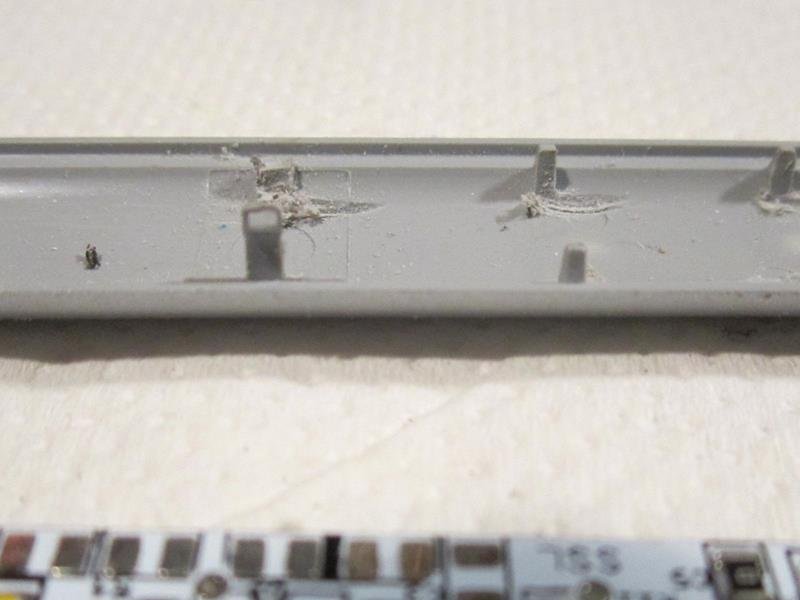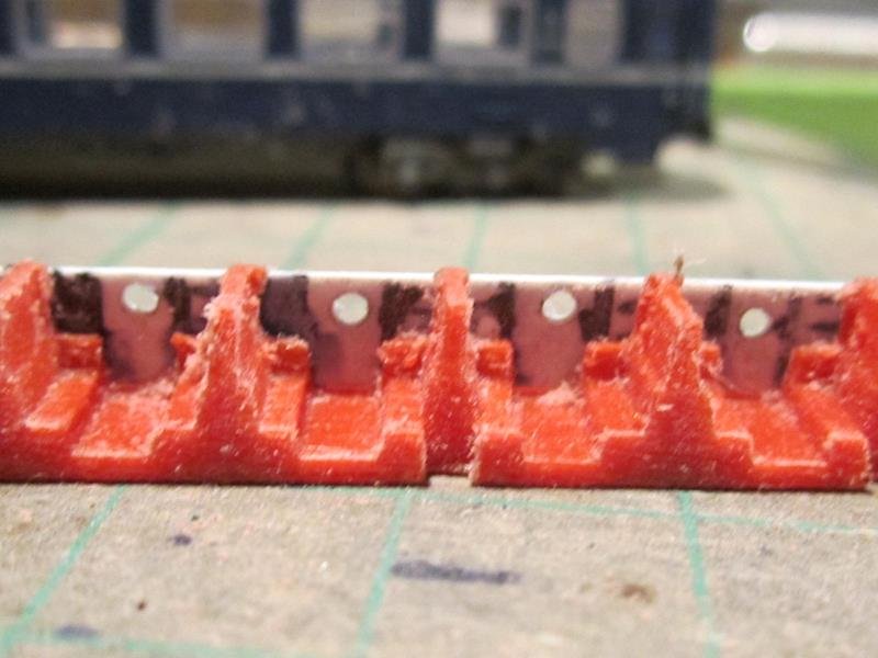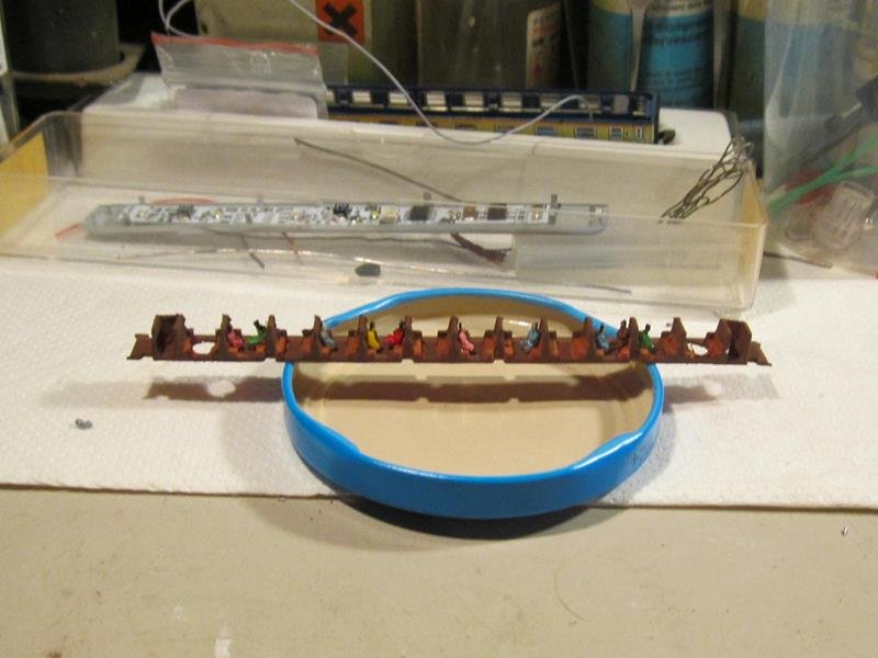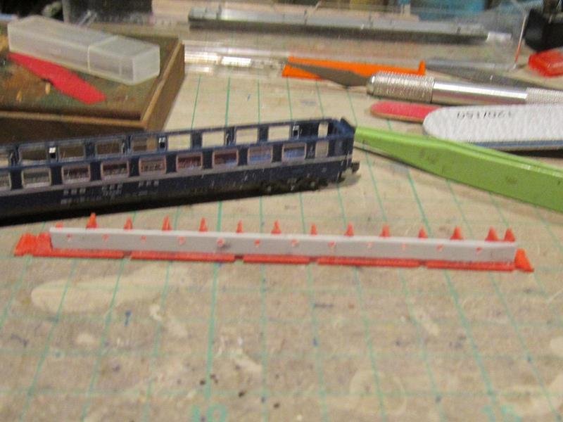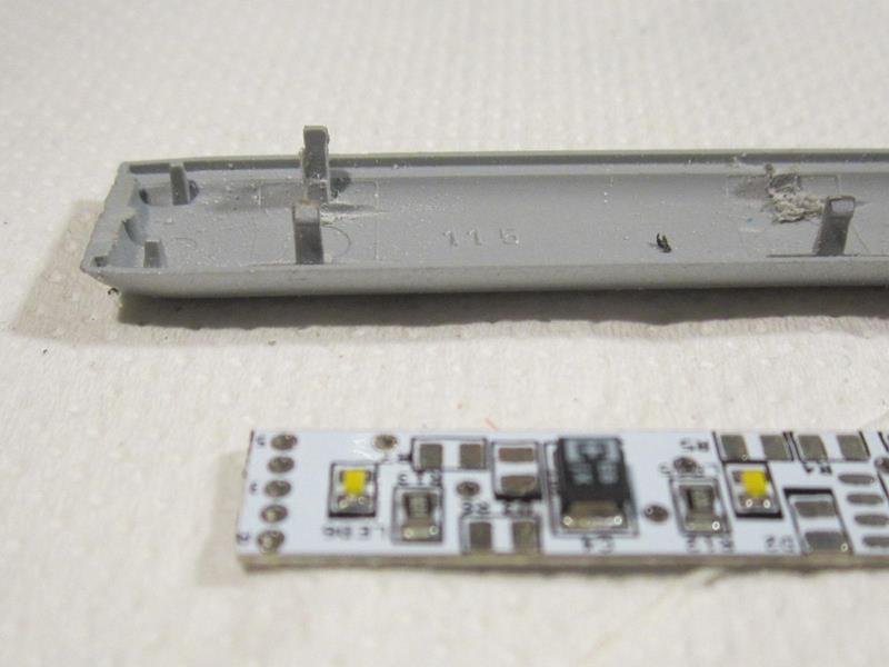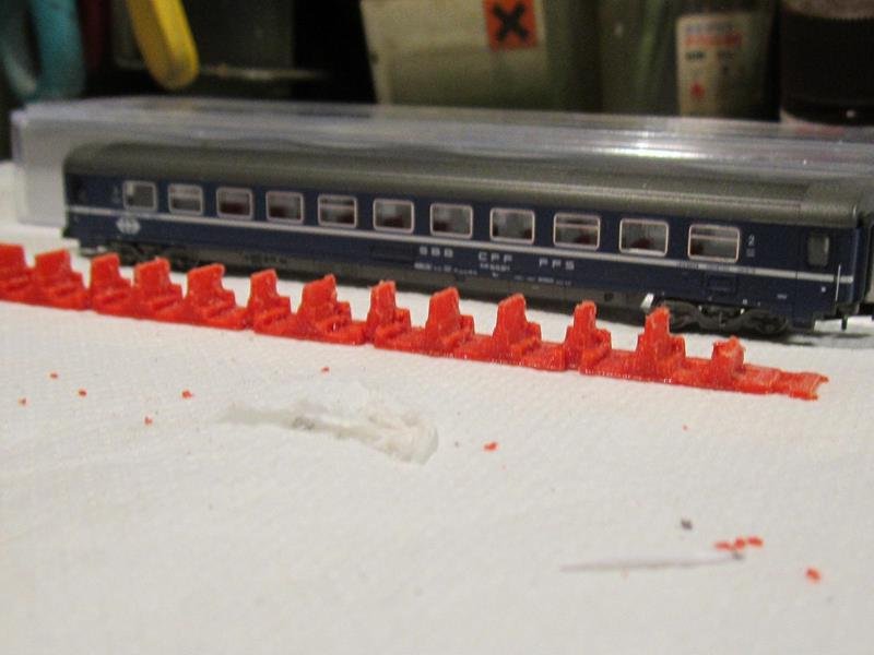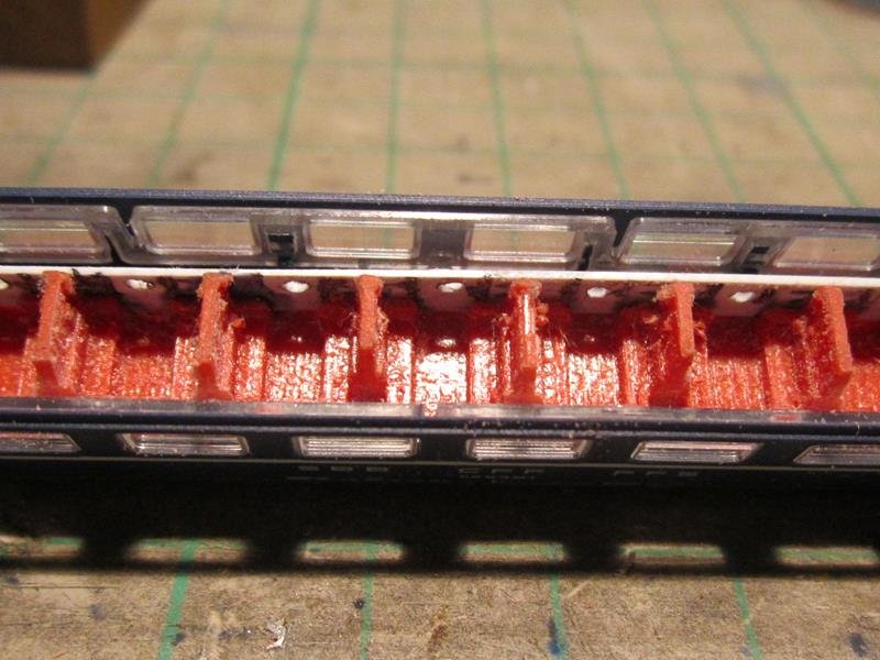 Le nuove carrozze Marklin hanno una diversa disposizione dei perni reggi finestrini quindi ho dovuto modificare gli interni in 3D che avevo limando moltissimo i lati inferiori, per inserirli al interno. Eliminare una ritirata per far posto al condensatore è posizionare una strep in plasticard per la parete tra gli scompartimenti e corridoio.