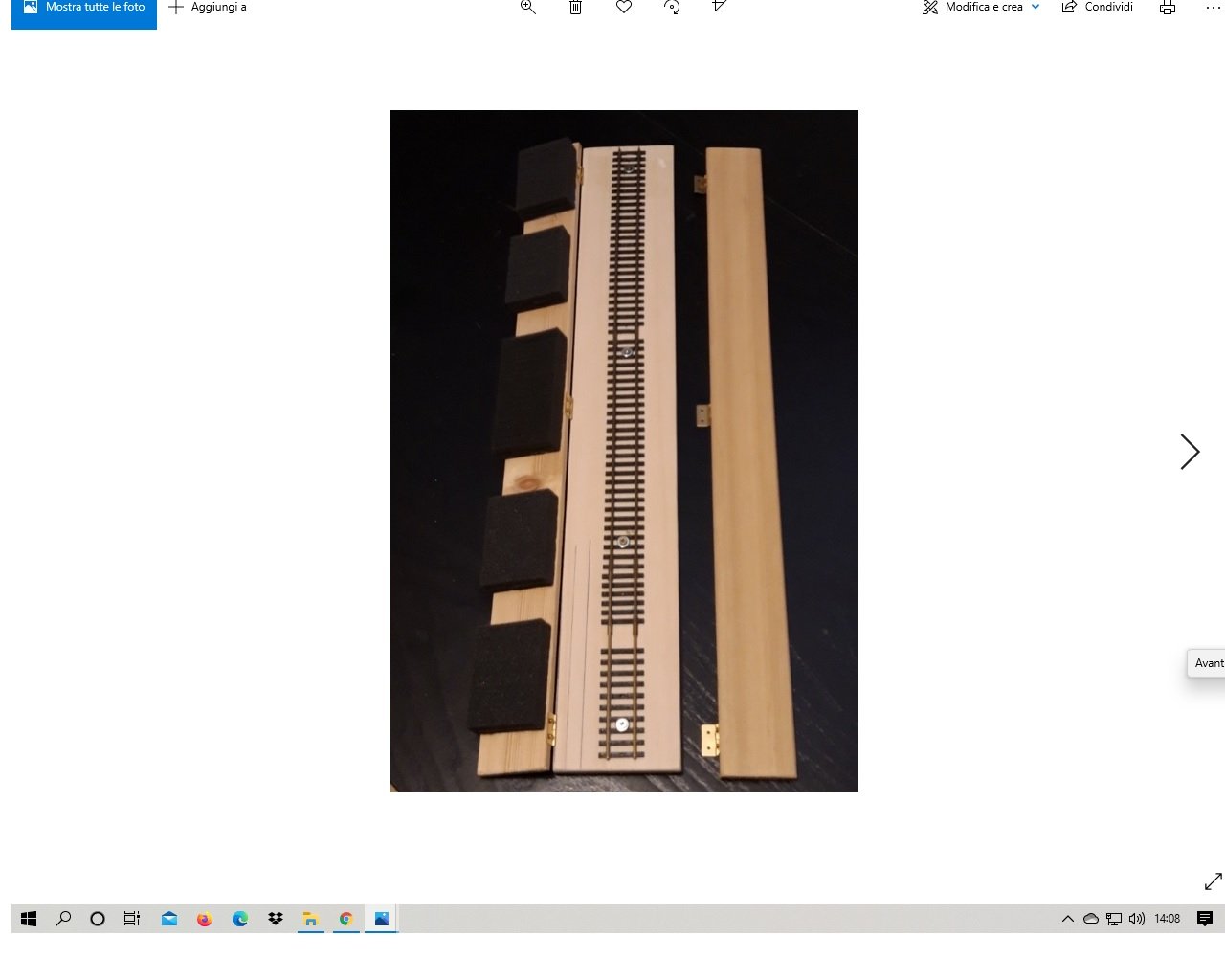 Dal materiale presente in casa ho recuperato: una base di 83 x 12 mm e due listelli da 50 x 10 mm, tutti a lunghezza 60 cm; sei piccole cerniere con vitine 2 x 8 mm e i rimasugli della gommapiuma usata per riporre le ottiche della reflex; vecchi binari Fleishmann codice 100.