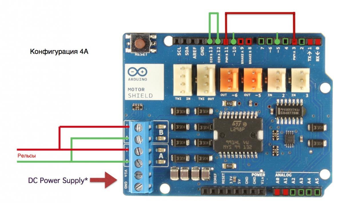 qui invece c'è una versione con altri ponticelli dove è possibile usare due uscite, la A come principale e la B come binario di programmazione, trovi sia con l'Arduino uno