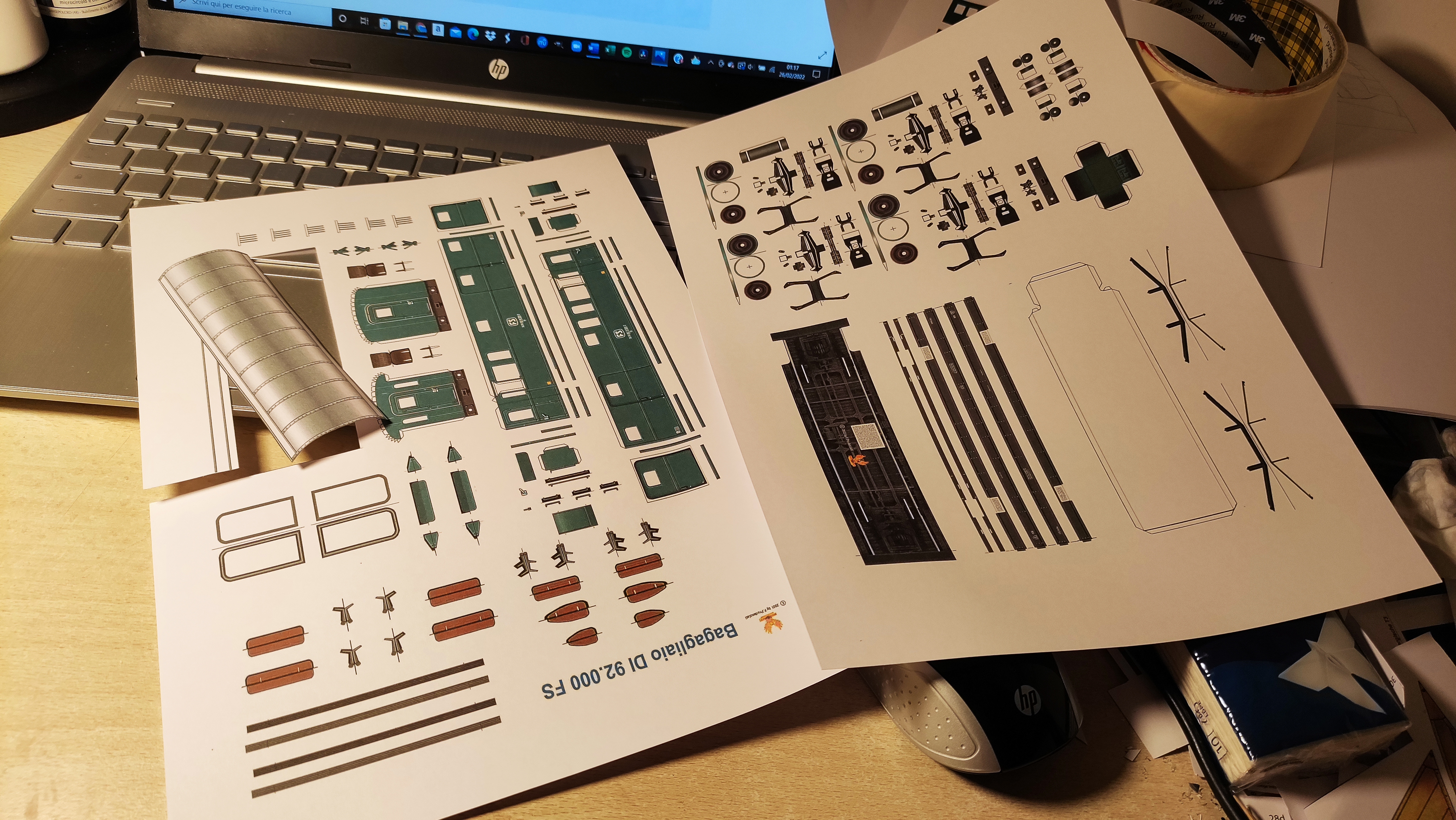 Ebbene sì, ho sospeso per ora il montaggio degli ultimi dettagli sulla loco e ho fatto la stampata di una prima versione della carrozza. Ecco come ho pensato di procedere: riciclo telaio (da modificare un po'), ruote, tetto e accessori da un modello di vagone bagagliaio, sempre di ZioPrudenzio.