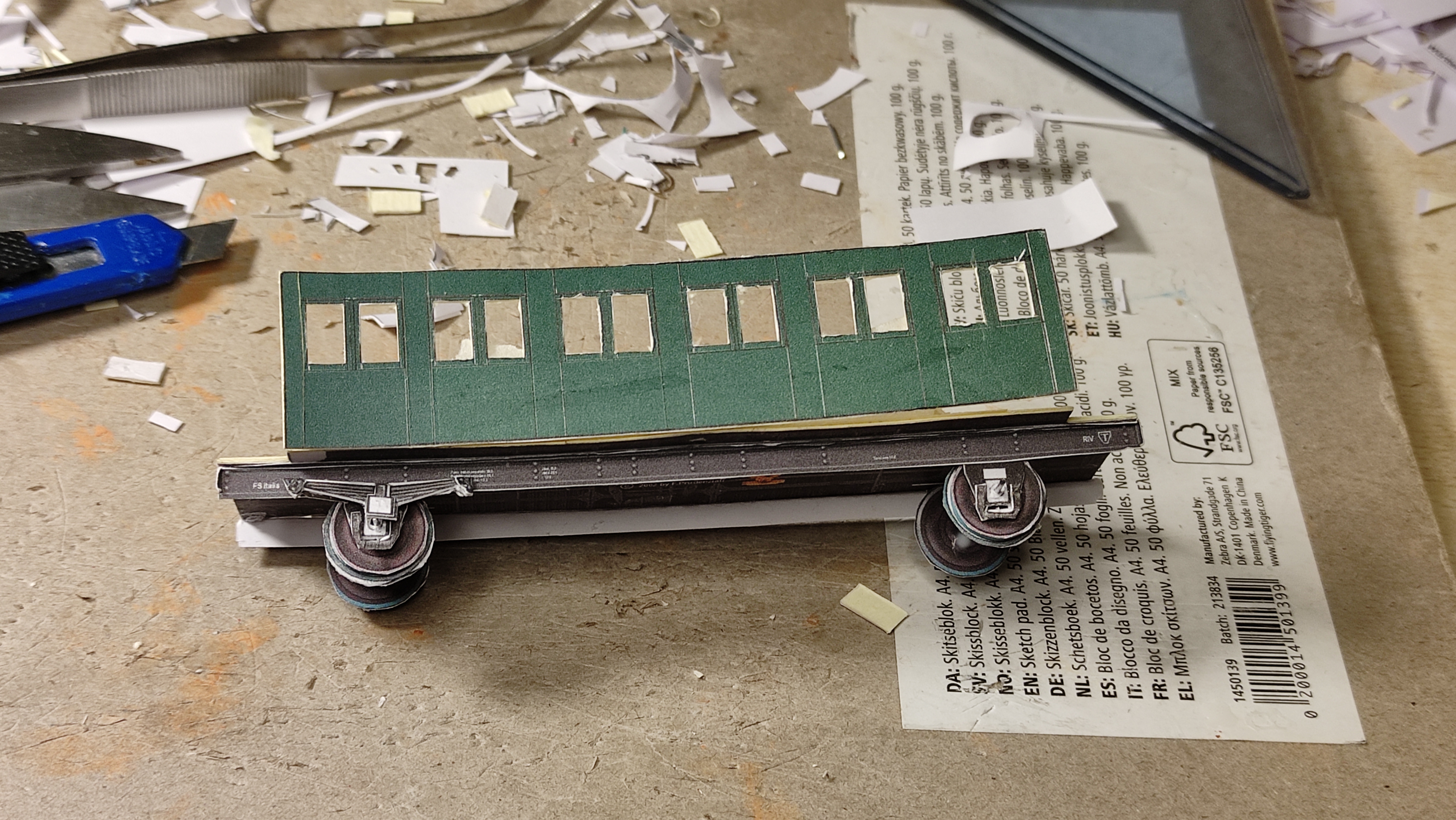sperando di fare cosa gradita tenendovi aggiornati sui minimi avanzamenti dei lavori, vi propongo un aggiornamento notturno. Ho appena terminato di impostare la carrozza a due assi e terrazzini: in pratica, come già anticipato, sfrutto la base di un vagone bagagliaio di ZioPrudenzio, pressoché uguale nel telaio e perfettamente identico negli assi.