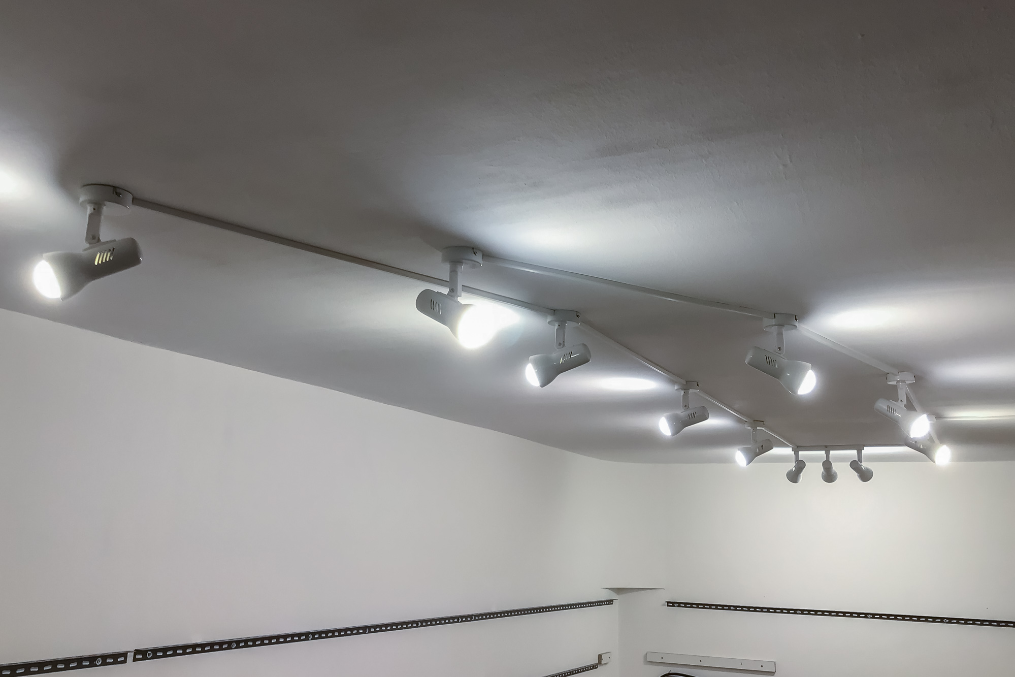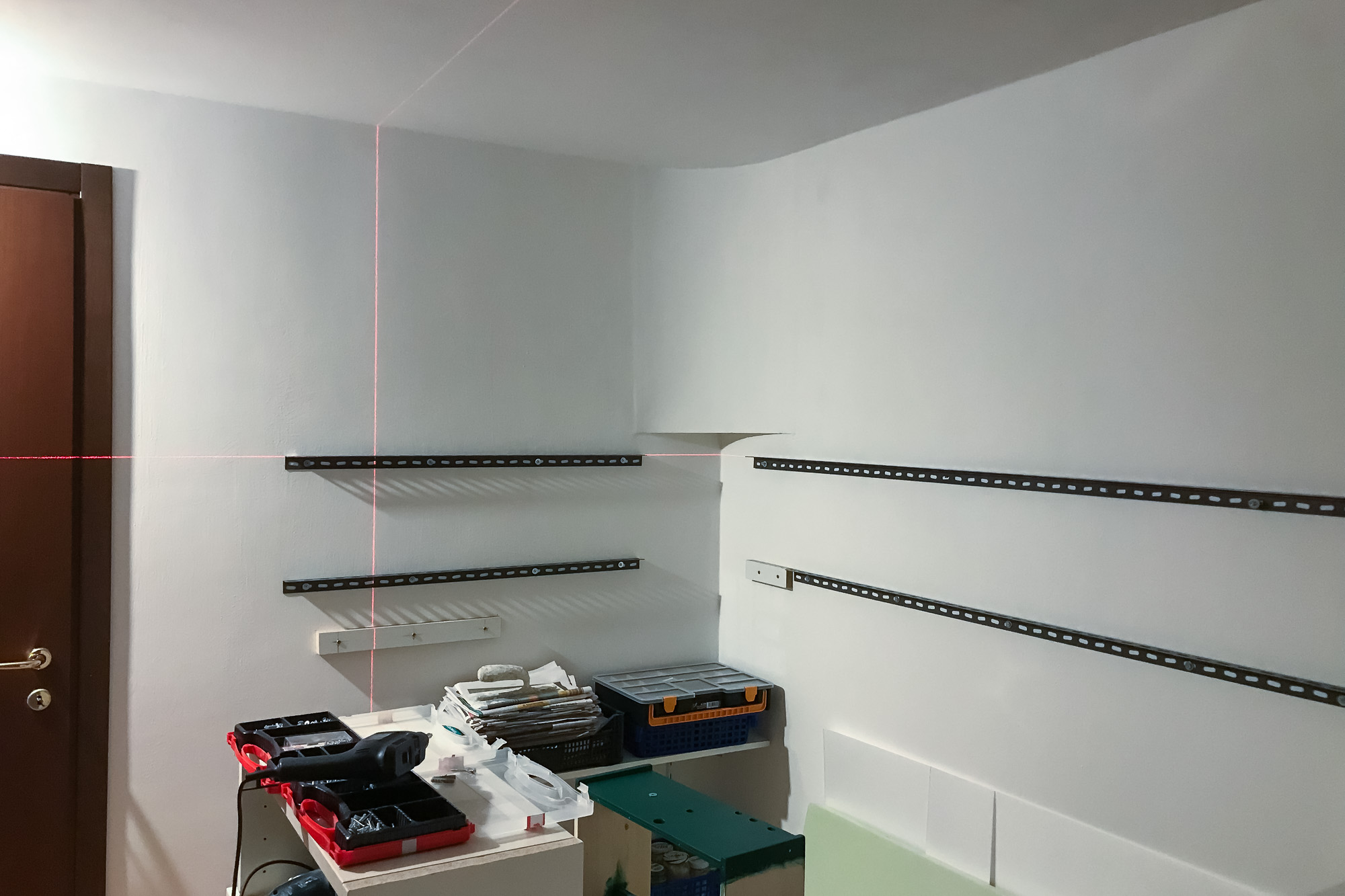 Avendo constatato che ci sono differenze significative nella distanza pavimento/soffitto in diversi punti della stanza, mi sono procurato una livella laser per essere sicuro di posare i supporti in orizzontale e alla stessa altezza su tutte le pareti.
