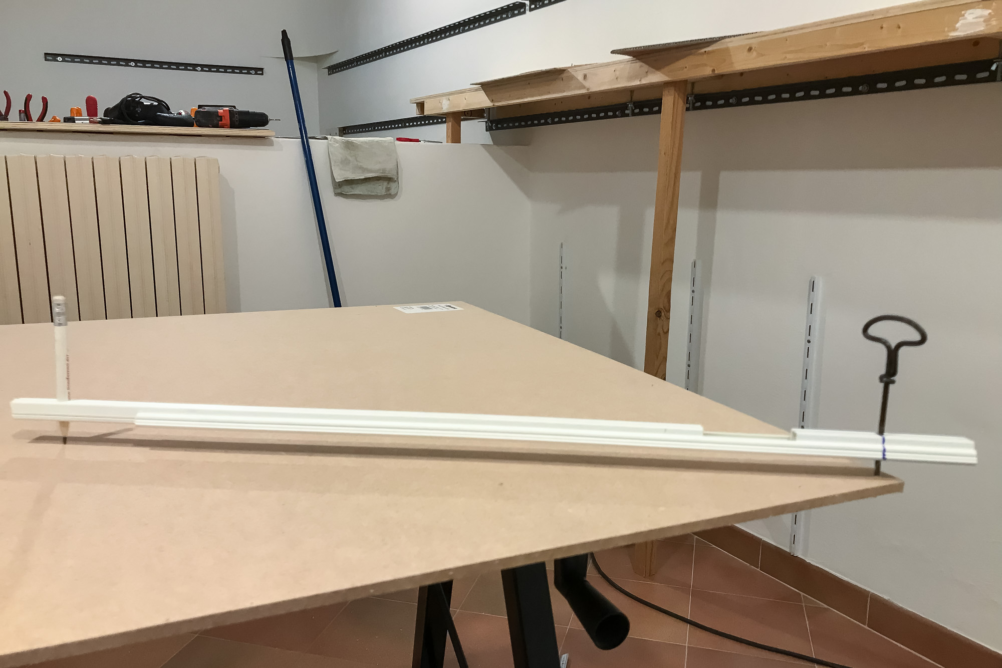 Nelle ultime settimane ho preparato la stanza (abbattimento parete, arrotondamento angoli, tinteggiatura, scaffalatura sotto al plastico per riporre il materiale,…).