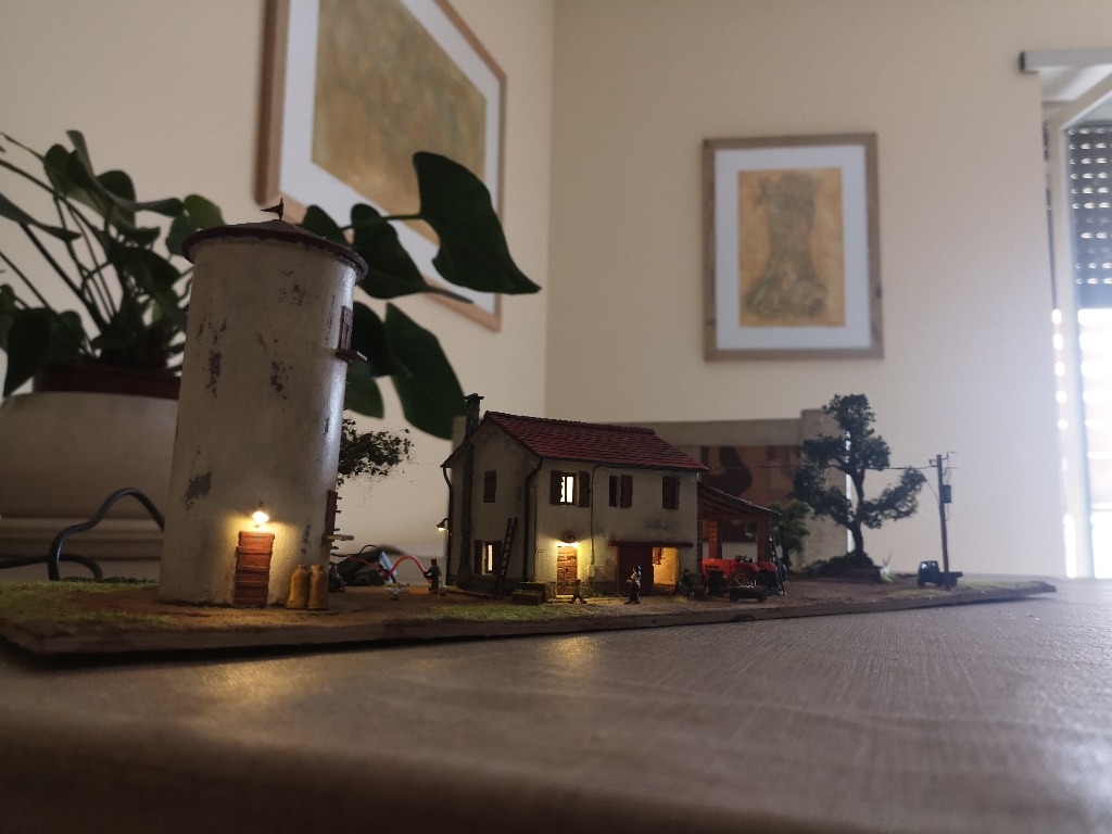 Ho solo una piccola osservazione, ma prendila con le pinze: vedo che il tetto della tettoia a lato della casa è un po' incurvato, perché è poggiato direttamente sulle colonne e alla parete. Mi sarei aspettato, sotto, un'intelaiatura di travi come (presumo) al vero... Ma ripeto che è una piccolezza, che forse ad occhio nudo nemmeno si nota e non toglie nulla alla bellezza dell'opera!