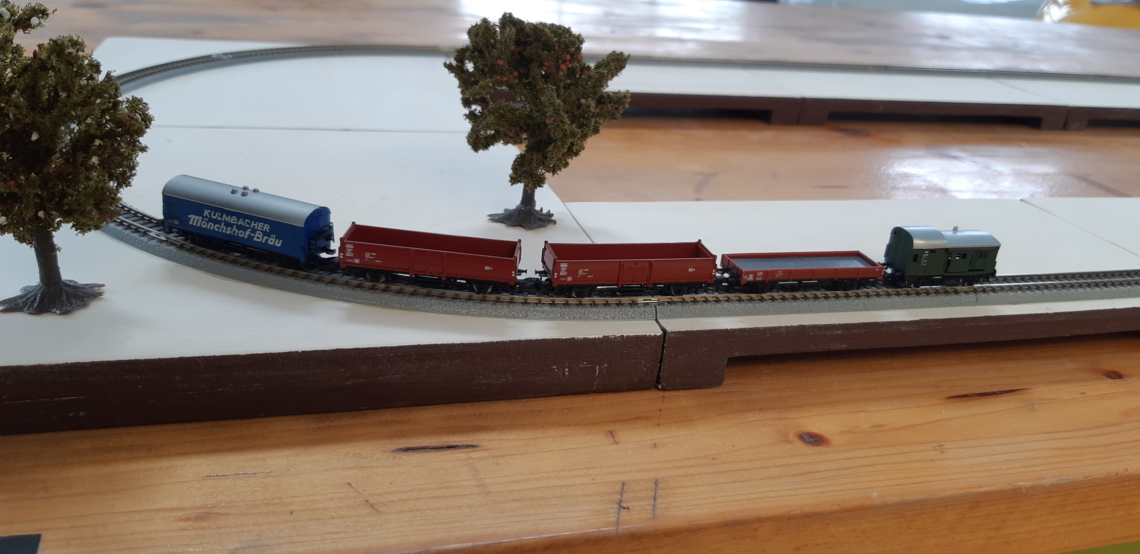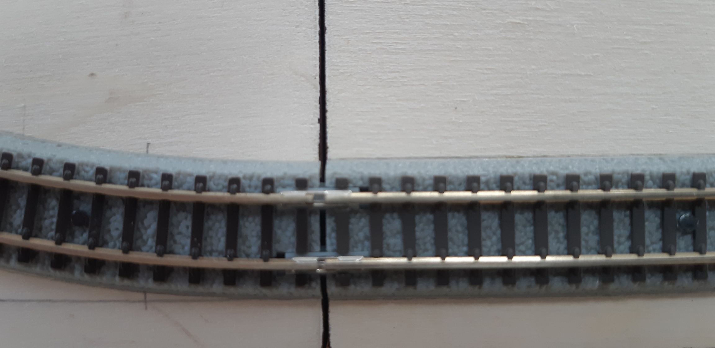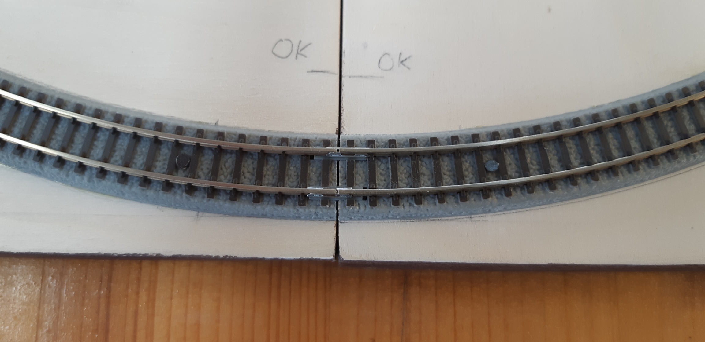 Sembra che il binario sia leggermente scarso rispetto alla fine della massicciata che è a filo del modulo in legno.