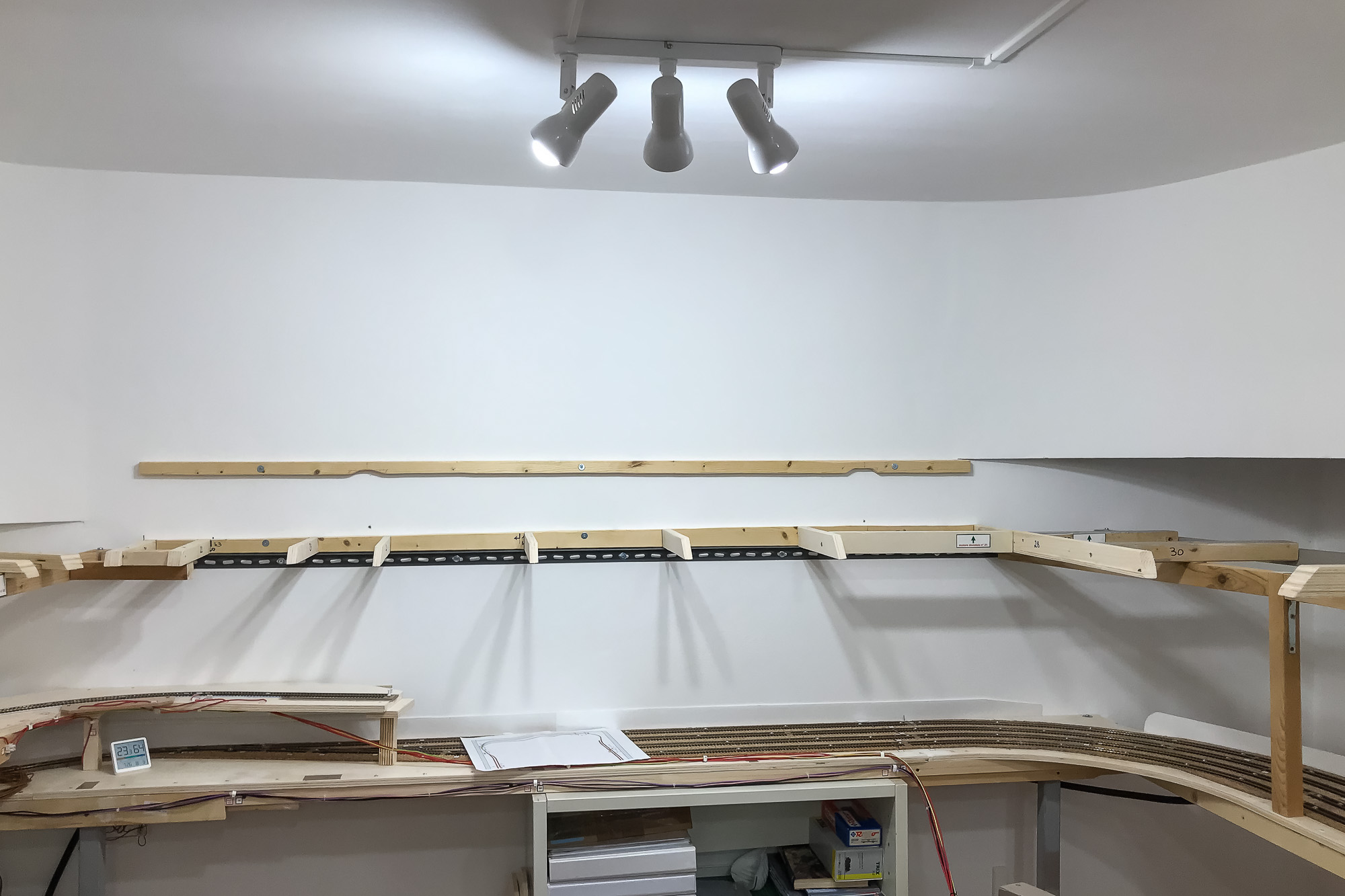 Sui lati lunghi della stanza la struttura si appoggia posteriormente ai profilati metallici mentre anteriormente ci sono robusti pali di abete 4x4 che in seguito serviranno anche da appoggio per lo sfondo del sottostante plastico in H0 (FS+DB).