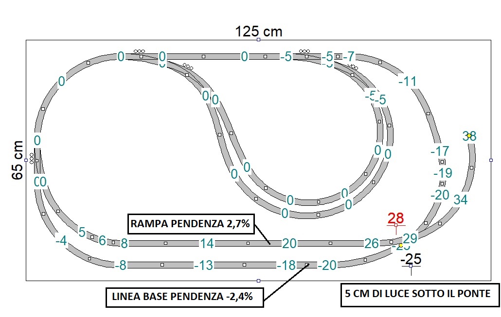 In pratica devo solo modificare la rampa, in quanto dal punto A al punto B mi ero già alzato di 2 cm (a superare i 2 cm di dislivello entrambe le locomotive non mi hanno mai creato problemi, ma è anche vero che la salita viene affrontato con binario dritto). Siccome all''inizio della rampa c'è una curva strettina (raggio 19.2) devo rimandare la costruzione finchè non mi ritorna indietro l'Anl 668 dall'assistenza per fare delle prove. Devo verificare se riesco ad inserire una curva con raggio di 22,56cm per stare più tranquilli.
