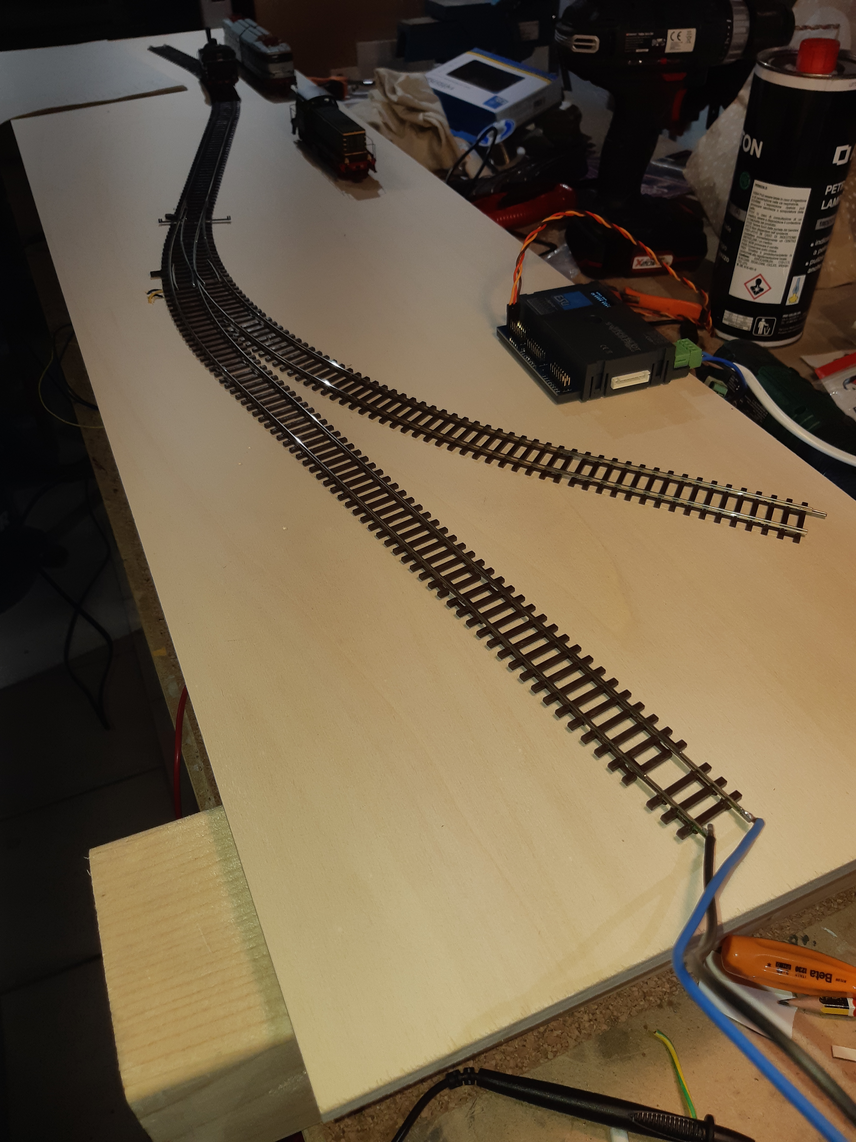 Ho realizzato il circuito come suggerito da Roberto, costituito da un deviatore inserito fra due tratti di binario. Ho collegato il tracciato alla uscita main track sulla centralina Z21 e ho azionato il deviatore con un servo comandato da uno switch pilot 3 (servo identico a quelli che ho istallato sul plastico). Ho alimentato in deocoder con lo stesso trasformatore che ho usato per alimentare il plastico (15 v 6 A) che ho collegato agli ingressi PwA e Pwb ed ho derivato dal bus di potenza (con cui ho alimentato il piccolo circuito) due cavi per portare il segnale all'ingresso Trak A e Trak B. Il tutto seguendo lo schema indicato nelle istruzioni di cui alla pagina 6 delle istruzioni dello Switch Pilot.Ho programmato il decoder utilizzando i tre pulsantini presenti sul decoder. Tutto molto semplice.