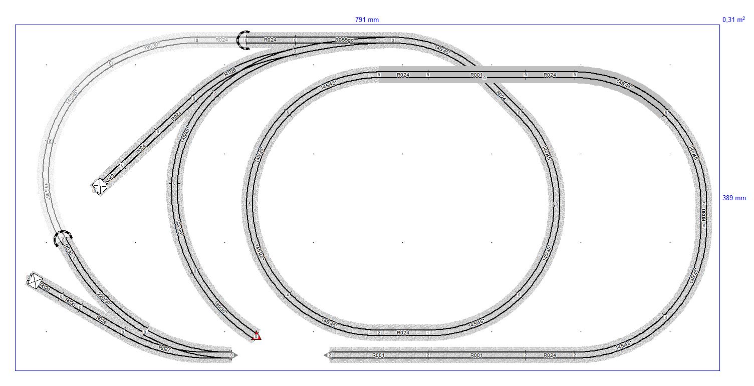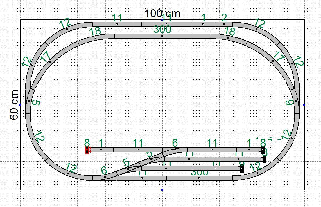 Una osservazione: a mio avviso hai un pò esagerato con i deviatoi, specie quelli curvi, che potrebbero dare problemi di svio (sempre in relazione al fatto che il tracciato è sotto un vetro e non di immediata raggiungibilità). A che ti servono quei due binari tronchi?