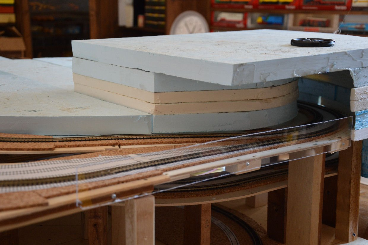 in questi giorni sono andato avanti con i lavori, alcuni definitivi altri posticci, volevo chiudere il circuito dei binari in modo da controllare tutta la parte definitiva dei due elicoidali con treni a lunghezza adatta al plastico. Avevo già provato le pendenze con convogli completi.