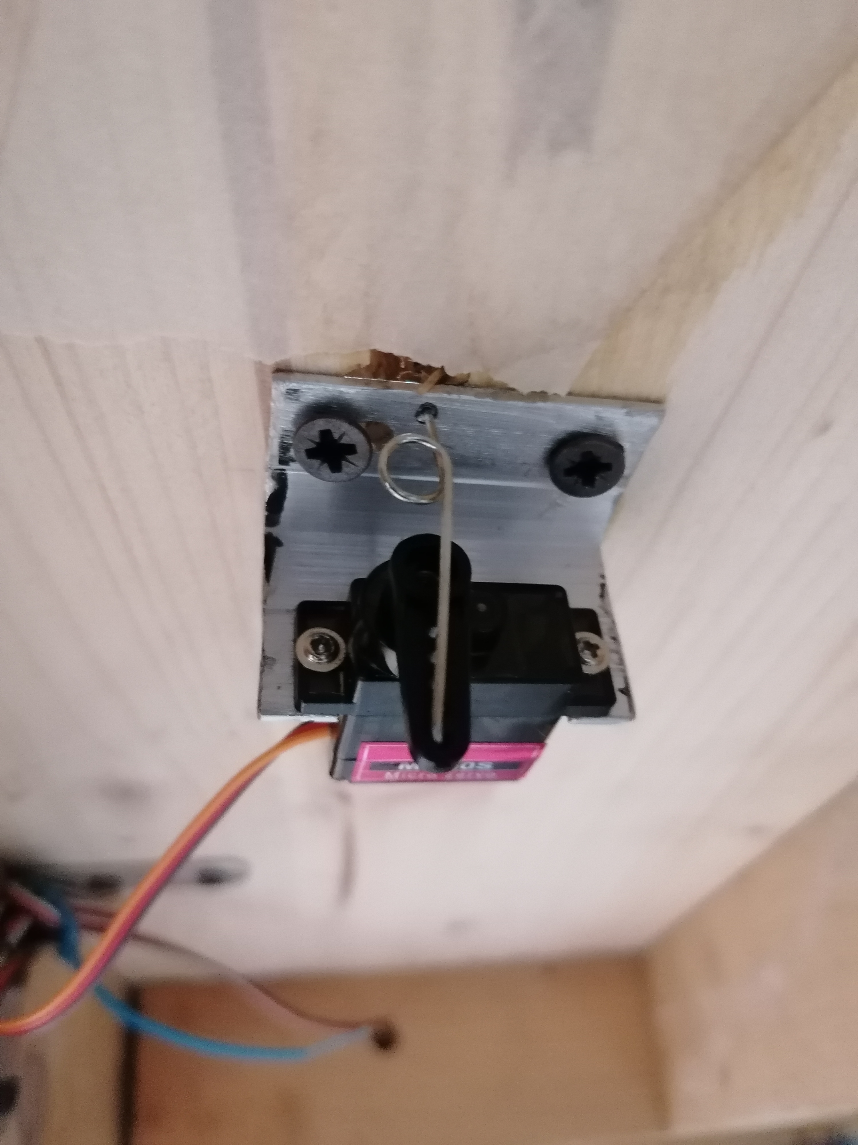 ti invio quanto mi chiedi. Installazione molto semplice, senza grandi pretese e funzionante. L'asta è ricavata da una spilla da balia aperta, funziona molto bene anche da molla per non sforzare troppo il servomotore.