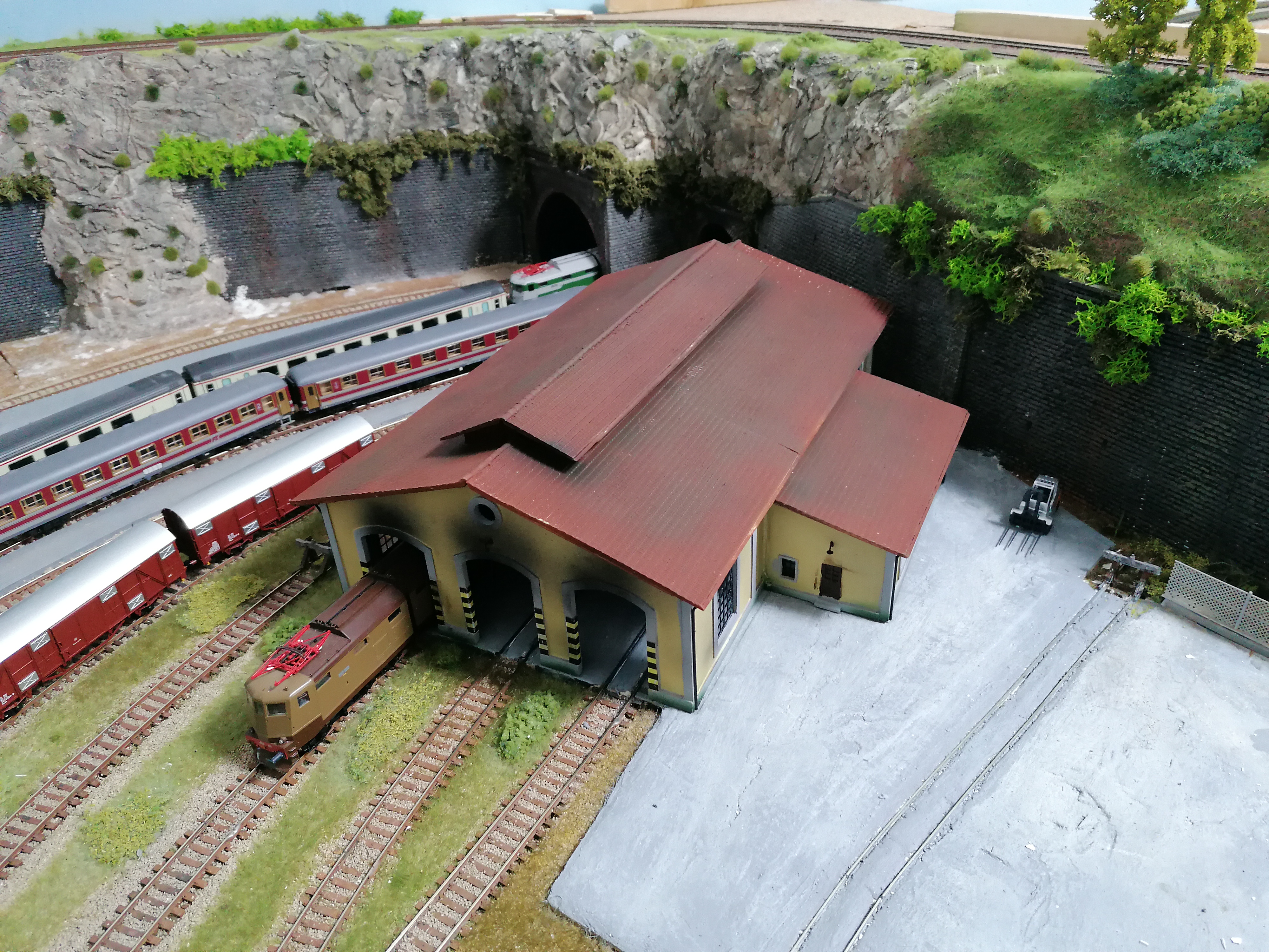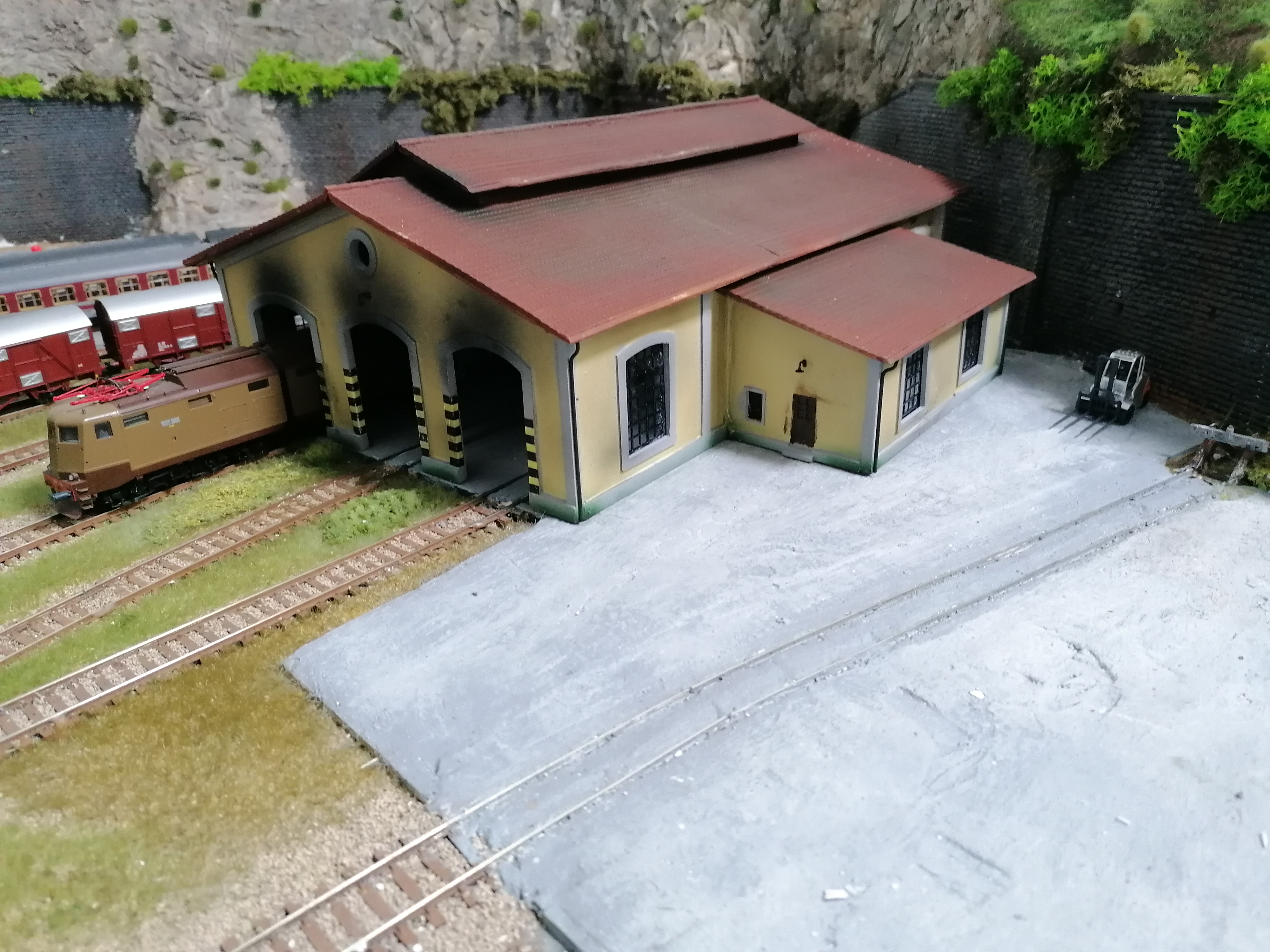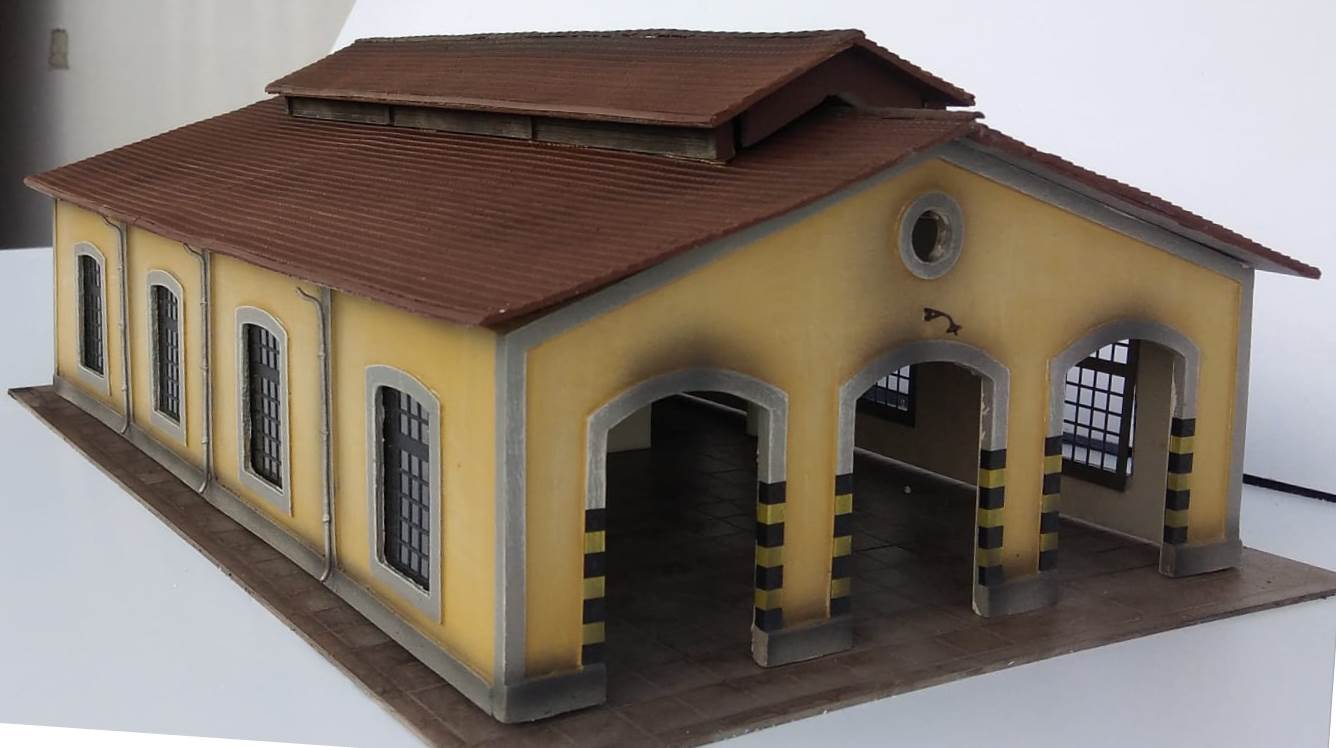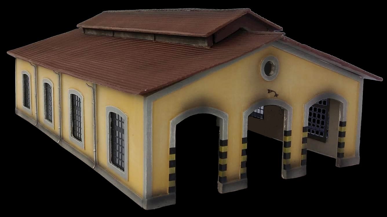 Si tratta di una rimessa locomotive a tre stalli delle FS con annessa officina, realizzata in resina con le finestre in fotoincisione.