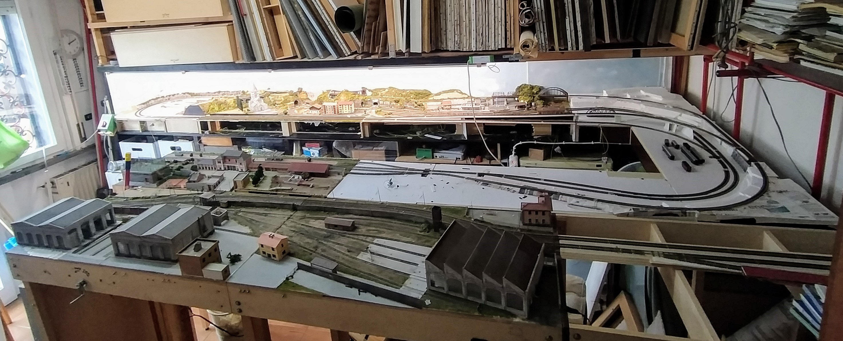 Avevo anche un modulo, sempre scala N, riproducente fedelmente la stazione di Genova Rivarolo. Ho costruito un modulino di raccordo e ho unito il tutto. Ho anche i due moduli "deposito locomotive" scala TT. Sono sempre chiusi nei loro imballi e mi piacerebbe godermeli. Ho pensato di trovare il modo di averli tutti disponibili e per fare questo posizionerò i moduli TT al centro del locale, ma vorrei anche dare un continuità al tutto e quindi, pensavo di fare una semplice linea a due binari TT che dal deposito curverebbe e andrebbe a passare davanti ai moduli N su quella mensolina stretta, che si vede davanti, nella prima foto.