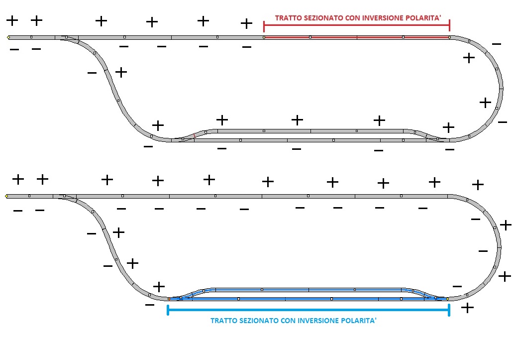 Occorre quindi sezionare il cappio in modo che ci sia un tratto di binario abbastanza lungo da contenere qualsiasi convoglio vi transiti, nel quale sia possibile invertire la polarità durante la marcia (cosa che in digitale non sortisce alcun effetto sulla marcia della loco). Questo tratto sezionato lo puoi mettere dove vuoi; chiaramente se il cappio ha una lunghezza molto ridotta, il sezionamento avverrà subito dopo i due rami del deviatoio e corrisponderà all'intera lunghezza del cappio. Ma se il cappio è lungo 30 metri, i 4-5 metri di sezione li metti dove vuoi.
