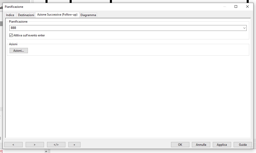 Spostati nella cartella "Azione successiva" e inserisci nella prima pianificazione il nome della successiva pianificazione, biffa la casella "attiva su evento enter" e conferma il tutto cliccando su "applica" in basso a sinistra.