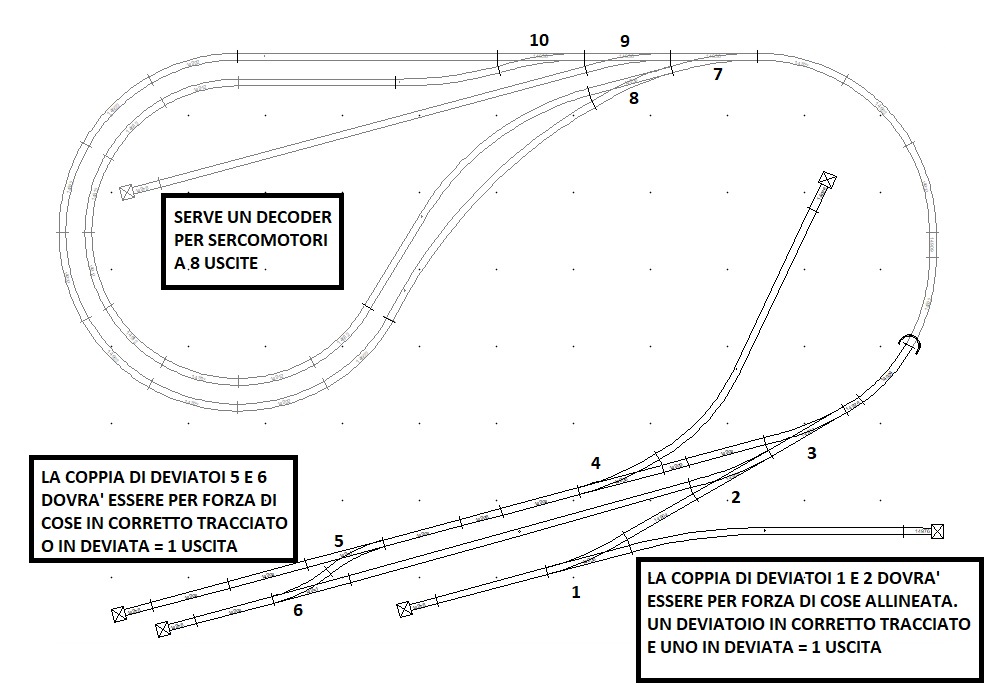 In ultimo ti servirà un decoder per servomotori da 8 uscite (o 2 da 4 uscite) anche se hai 10 deviatoi e 10 servomotori.