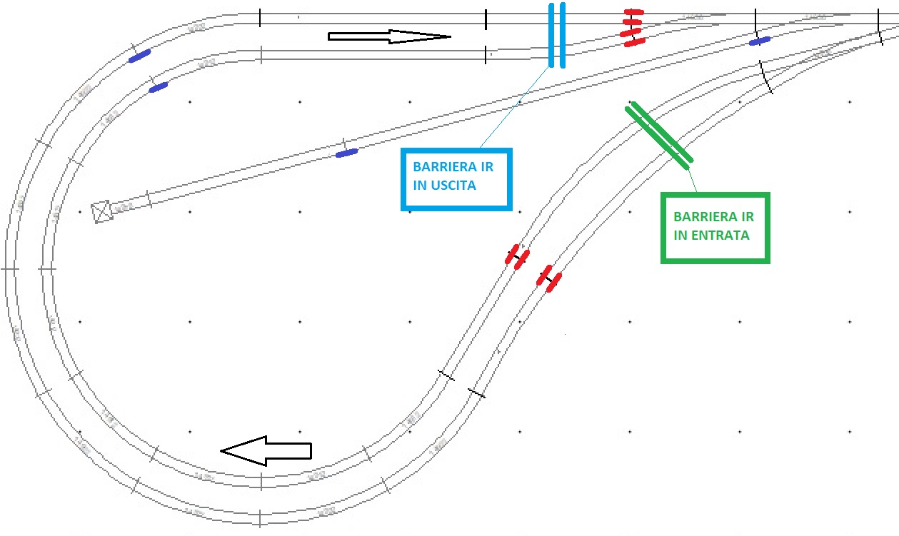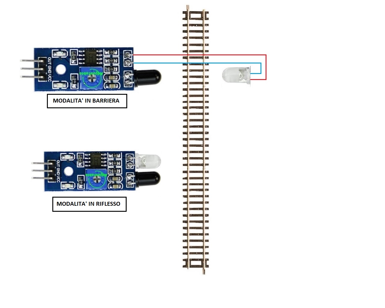 Nella basetta dei sensori posti a barriera per il cappio, infatti, il led di sinistra sarà sempre acceso e si spegnerà solo quando il passaggio del convoglio interromperà il fascio luminoso dall'emettore al ricevente.