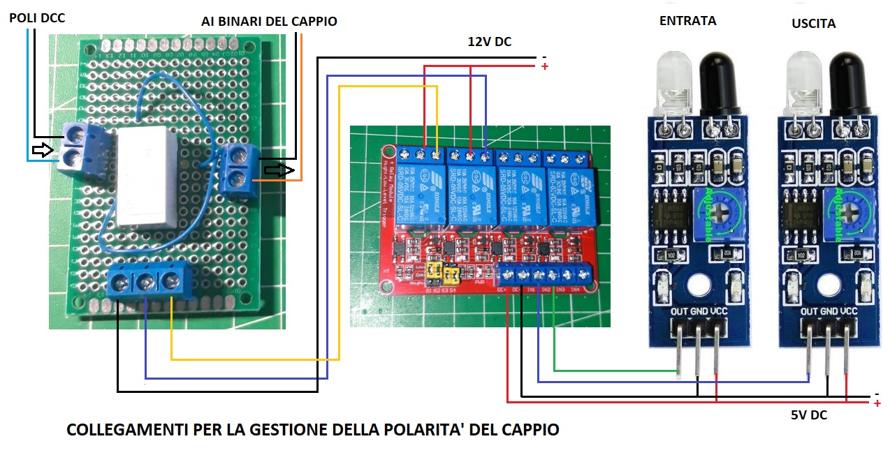 Si alimentano con 5V i sensori IR e il banco dei 4 relè.