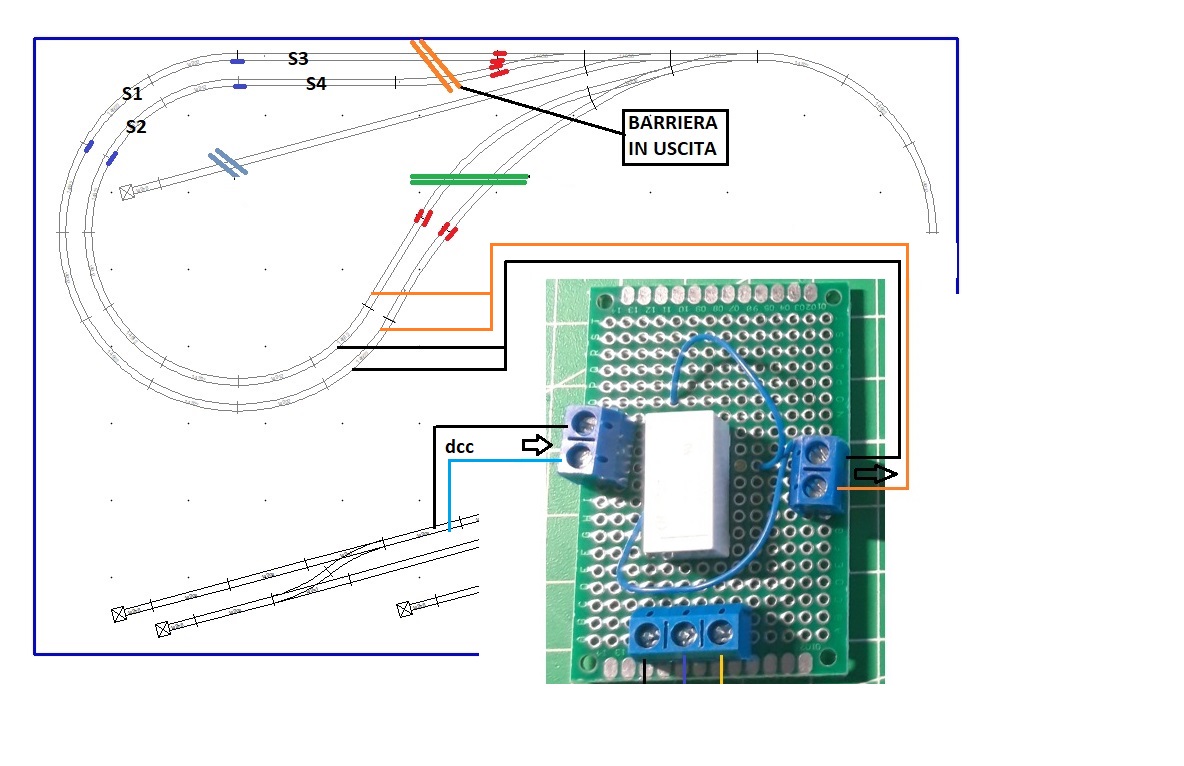 Ricorda, per le entrate dei 4 sensori, di prelevare il polo DCC dalla rotaia interna, la stessa dei tratti sezionati, ma all'interno cappio, perchè la polarità sarà di volta in volta diversa.