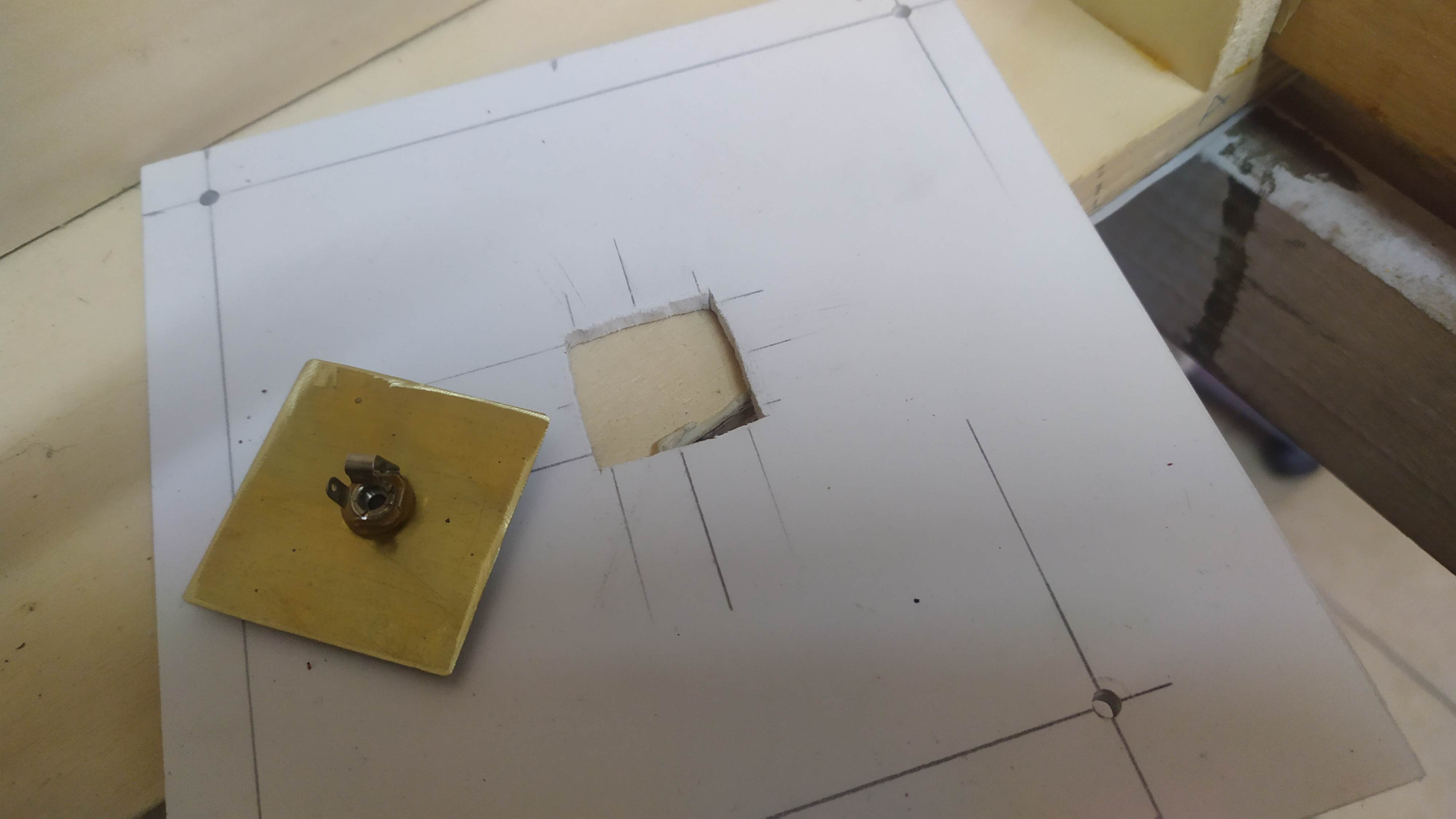 uno scasso sul pannello in forex da 2,5 x 2,5 mm per ospitare una sottile piastrina di ottone con uno spinotto jack da 3,5 mm.