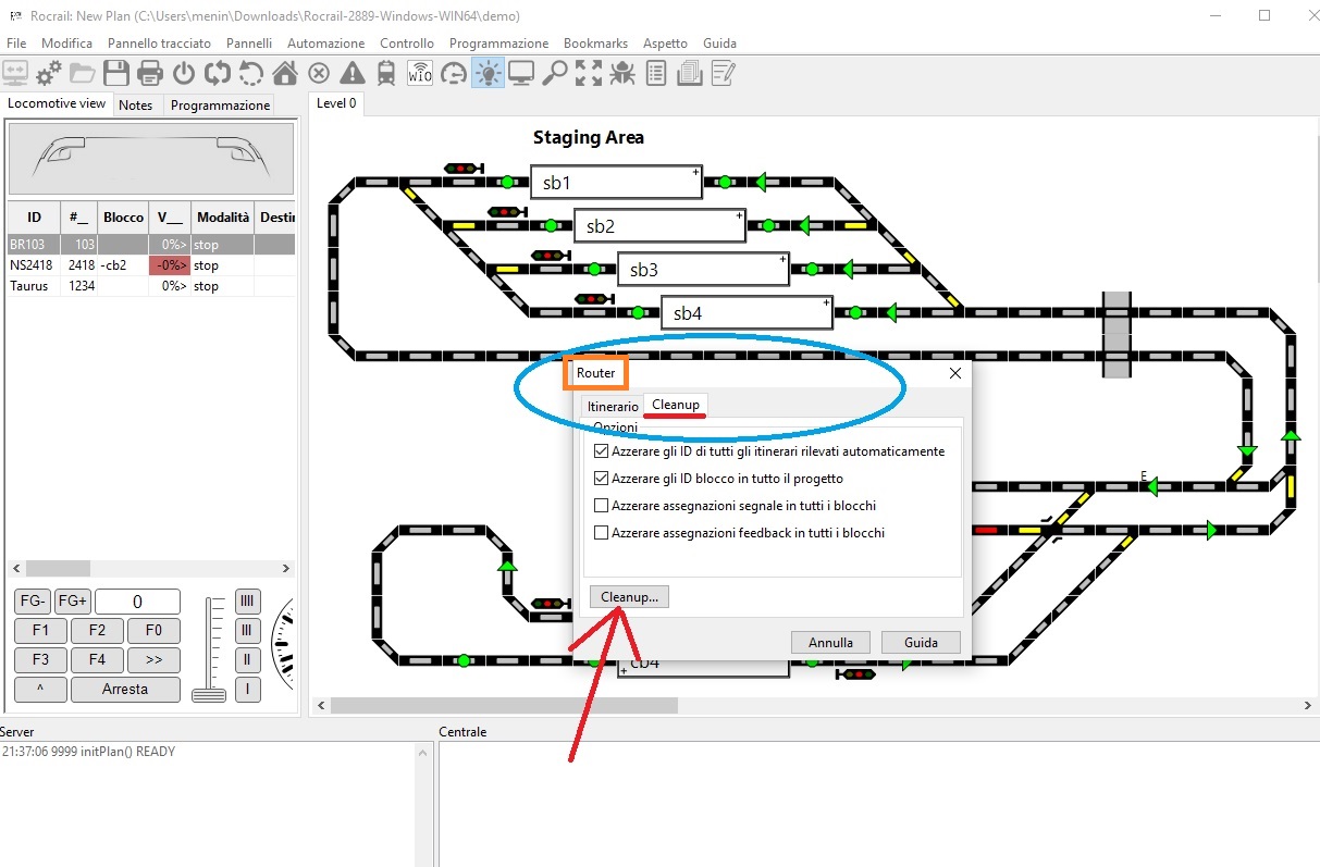 Cliccando sulla voce ROUTER, si apre una finestra con due opzioni; una, CLEAN UP di cancellazione degli itinerari esistenti (e altro ancora) attivabile cliccando sul tasto indicato dalla freccia