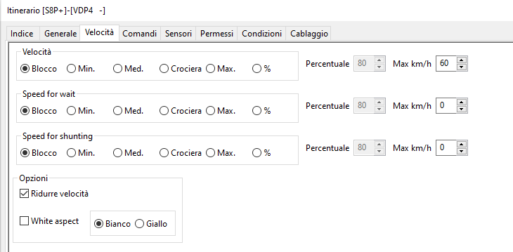 Ho risolto mettendo la spunta su "ridurre la velocità all'enter". In tal modo quando é attivato l'itinerario S8P - VDP4 con riduzione di velocità a 60 km/h quando impegna il sensore "enter" del blocco 'S8P, il treno inizia a rallentare alla velocità "media" con cui é impostato e la mantiene fino al sensore "in". Quindi se la velocità media di impostazione fosse di 80 la riduzione avviene ad 80. Io ho impostato a 60 anche il blocco VDP4. Sugli itinerari privi di riduzione di velocità come quelli di corretto tracciato o passanti la riduzione di velocità non avviene. Quindi questa impostazione é vincolante.