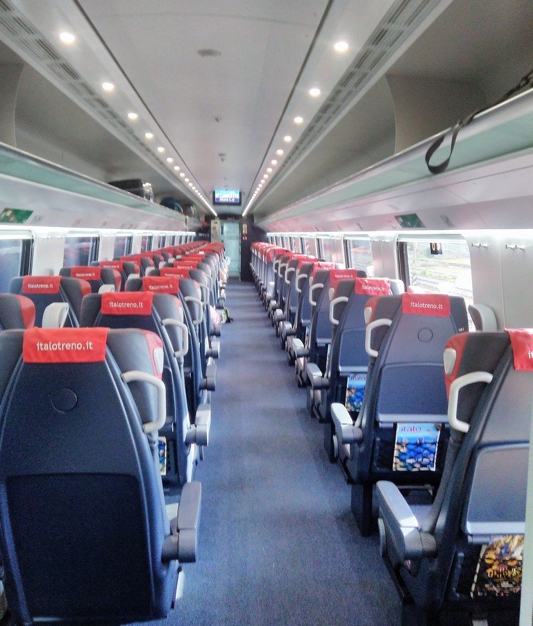 Per raggiungere Brescia utilizzo il treno Italo 8975 per Venezia Santa Lucia, previsto in partenza alle 7:35. Il treno giunge in orario al binario 4 della stazione di Torino Porta Susa ed è un ETR 675, entrato in servizio nel 2018 e prodotto da Alstom nello stabilimento di Savigliano (CN). Salgo a bordo, dove ho assegnato il posto 35 nella carrozza 2, ambiente Prima. Lungo la banchina sono presento dei monitor che indicano in maniera abbastanza precisa la posizione delle vetture, in modo da agevolare le operazioni di salita dei passeggeri.