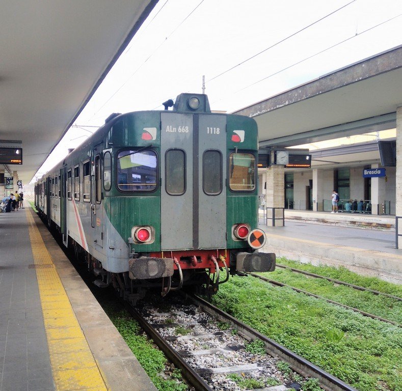 Dopo avere fermato ad Asola, superiamo Calvisano e Ghedi, quindi ci inoltriamo in un territorio più urbanizzato, dove la rete infrastrutturale si fa più fitta e le coltivazioni agricole lasciano spazio a molte industrie, alcune delle quali di grosse dimensioni e attrezzate per le lavorazioni siderurgiche pesanti. Il treno viaggia sempre in orario, quindi giungiamo a Brescia alle 14:08.