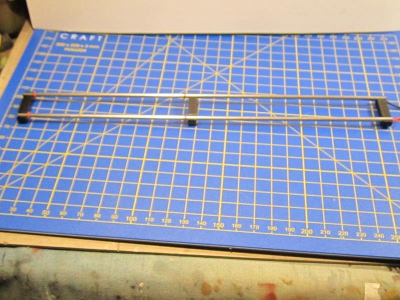 Il banco rulli si compone di due barre in metallo elettro conducibili con tre distanziatori a cui sopra andranno messi i dolly ( corpo in plastica è parti metalliche che sorreggono i cuscinetti )