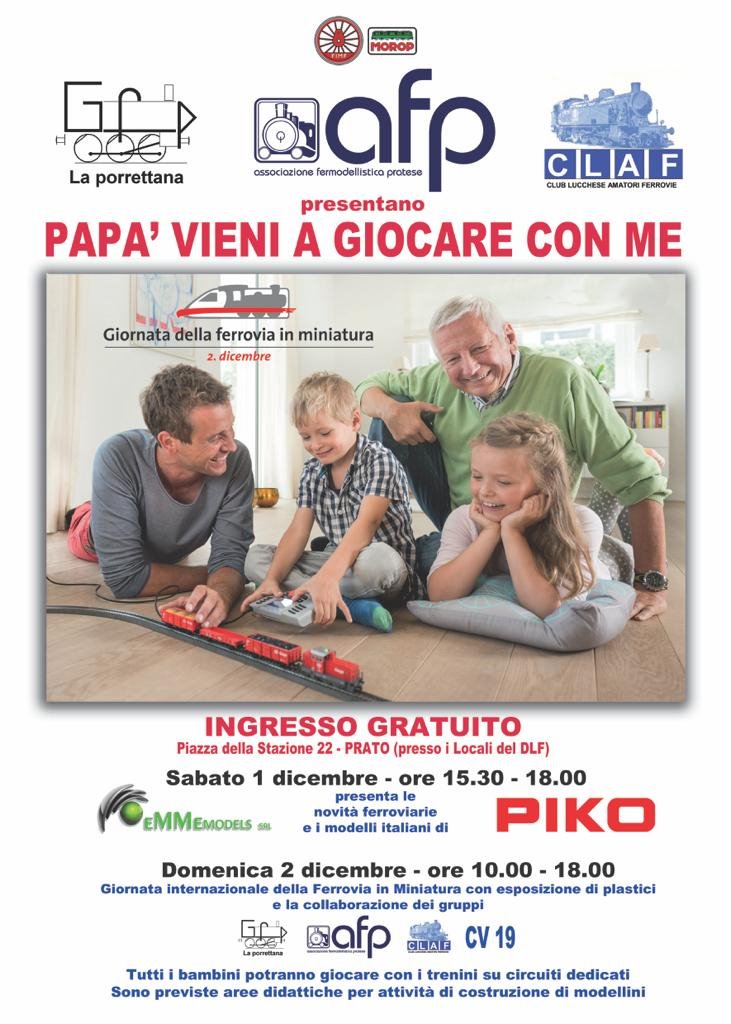 I gruppi Gemellati A.F.P. - G.F.P. "la Porrettana" e C.L.A.F. organizzano per i giorni 1 e 2 dicembre la manifestazione "Papà, vieni a Giocare" correlata alla giornata internazionale della ferrovia Modello, quest'anno la location dell'evento sarà la sede AFP di Prato.