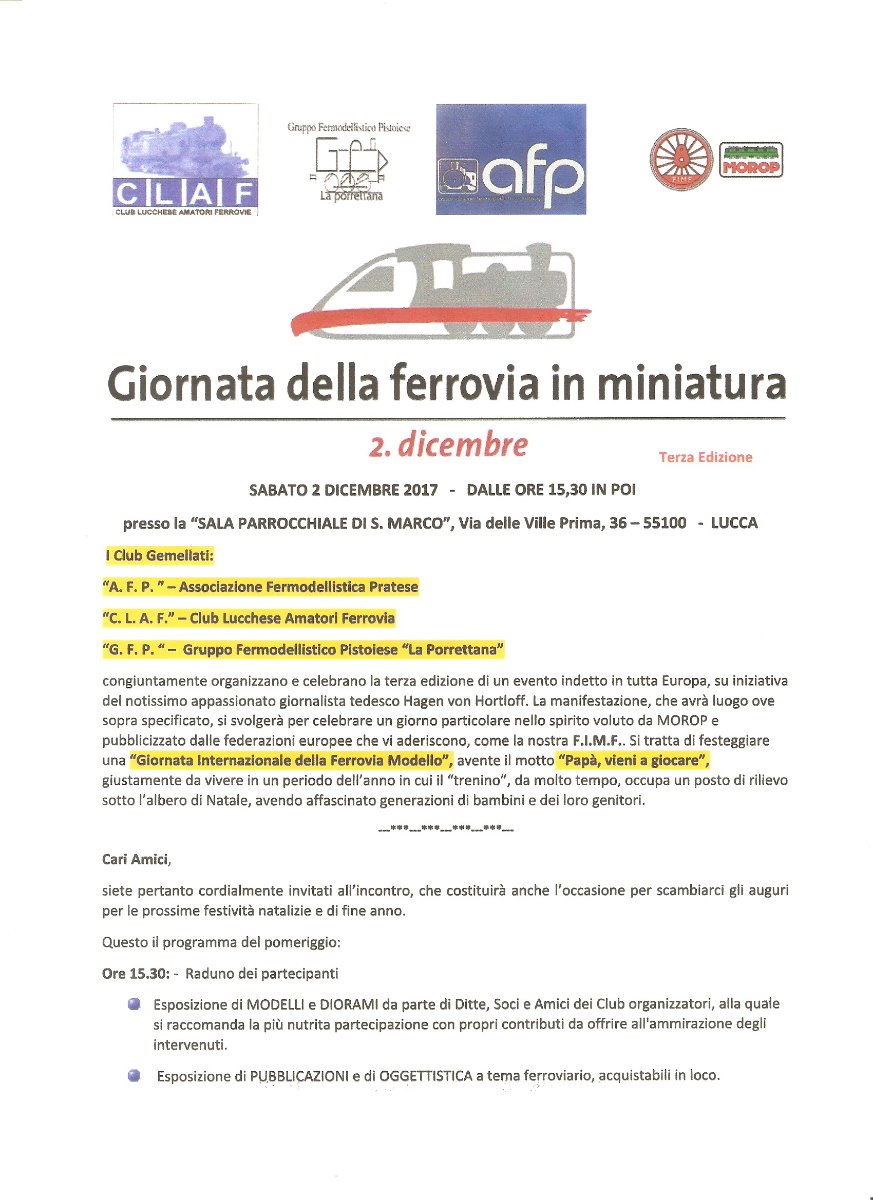 Volevo segnalare che il giorno 02/12/2017 i gruppi C.L.A.F. di Lucca, A.F.P. di Prato e G.F.P. di Pistoia organizzano in maniera congiunta il classico convivio natalizio correlato con la giornata della ferrovia modello