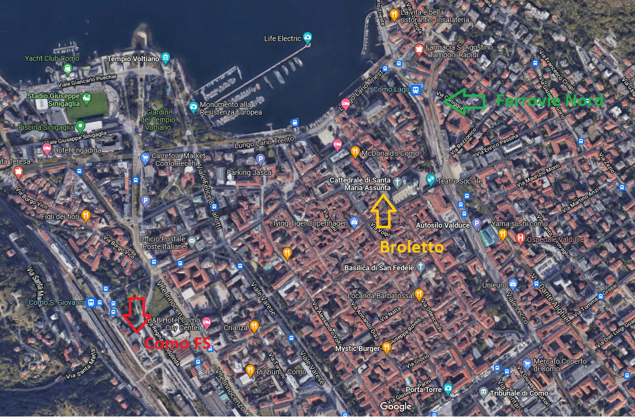Il palazzo del Broletto non è vicinissimo alla stazione FS, ma neanche troppo lontano. Sono circa 900 m a piedi su un percorso cittadino con marciapiedi e zone pedonali.