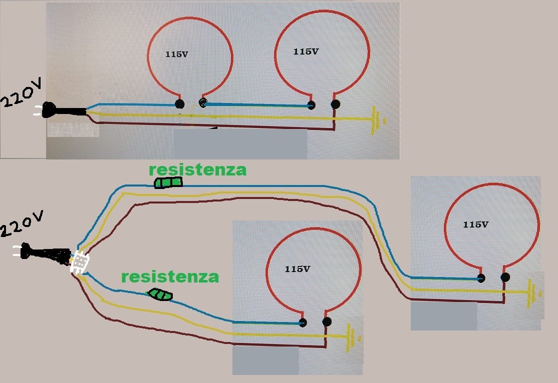 Grazie a tutti, però ho bisogno di uno schema.Anche schizzo a penna, oppure con paint modificate i miei disegni.Al momento sul fornetto originale mi pare non vi sia montata nessuna zavorra/resistenza funziona direttamente a 220 volt con ogni resistenza incandescente a 115 volt.Grazie mille a tutti!