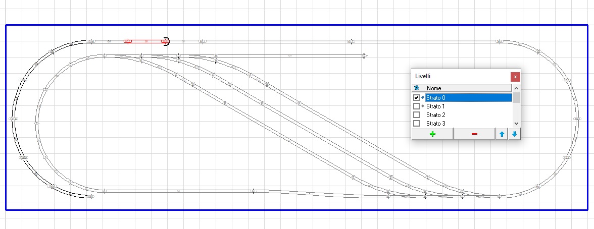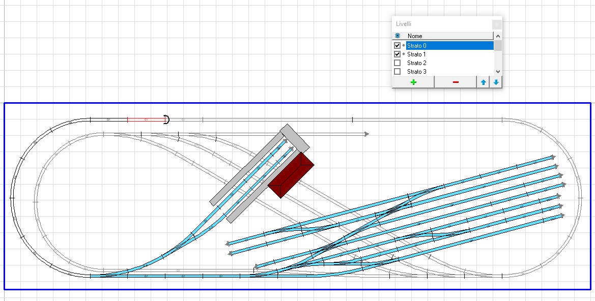 Questo invece il tracciato completo con le sovrapposizioni e con una ipotetica piccola stazione di testa a 2 binari.