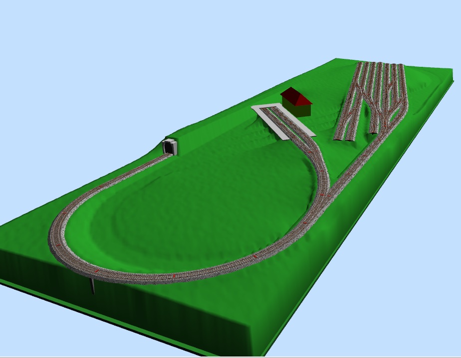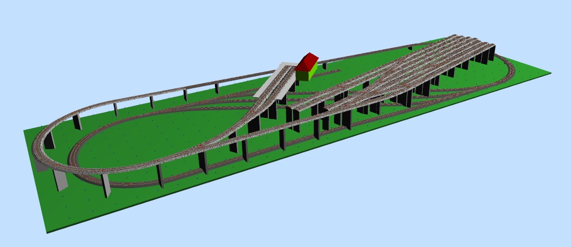 Base con cappio e stazione nascosta con 3 binari passanti più 1 tronco per automotrici o convogli reversibili. Inizia una rampa con pendenza 2,5% che arriva a 141 mm di altezza dopo la curva di sinistra.