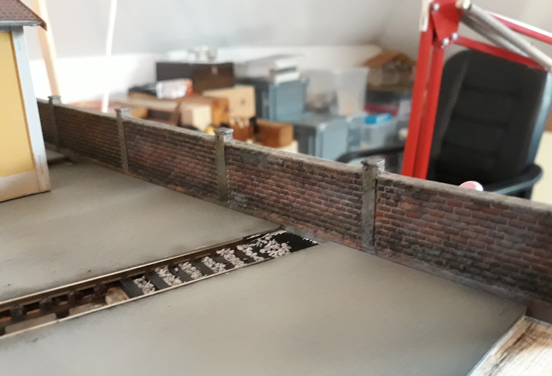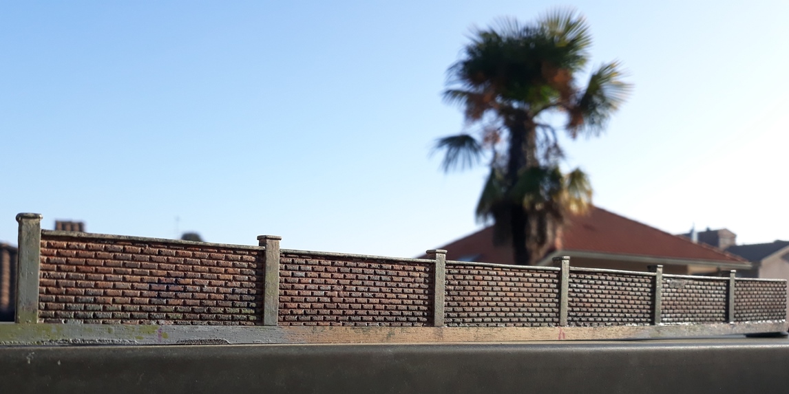 Il muro è un prodotto di Struttura Ferroviaria a cui ho messo mano con rifacimento della verniciatura e qualche modifica (manca di suddividere la parte superiore di copertura).