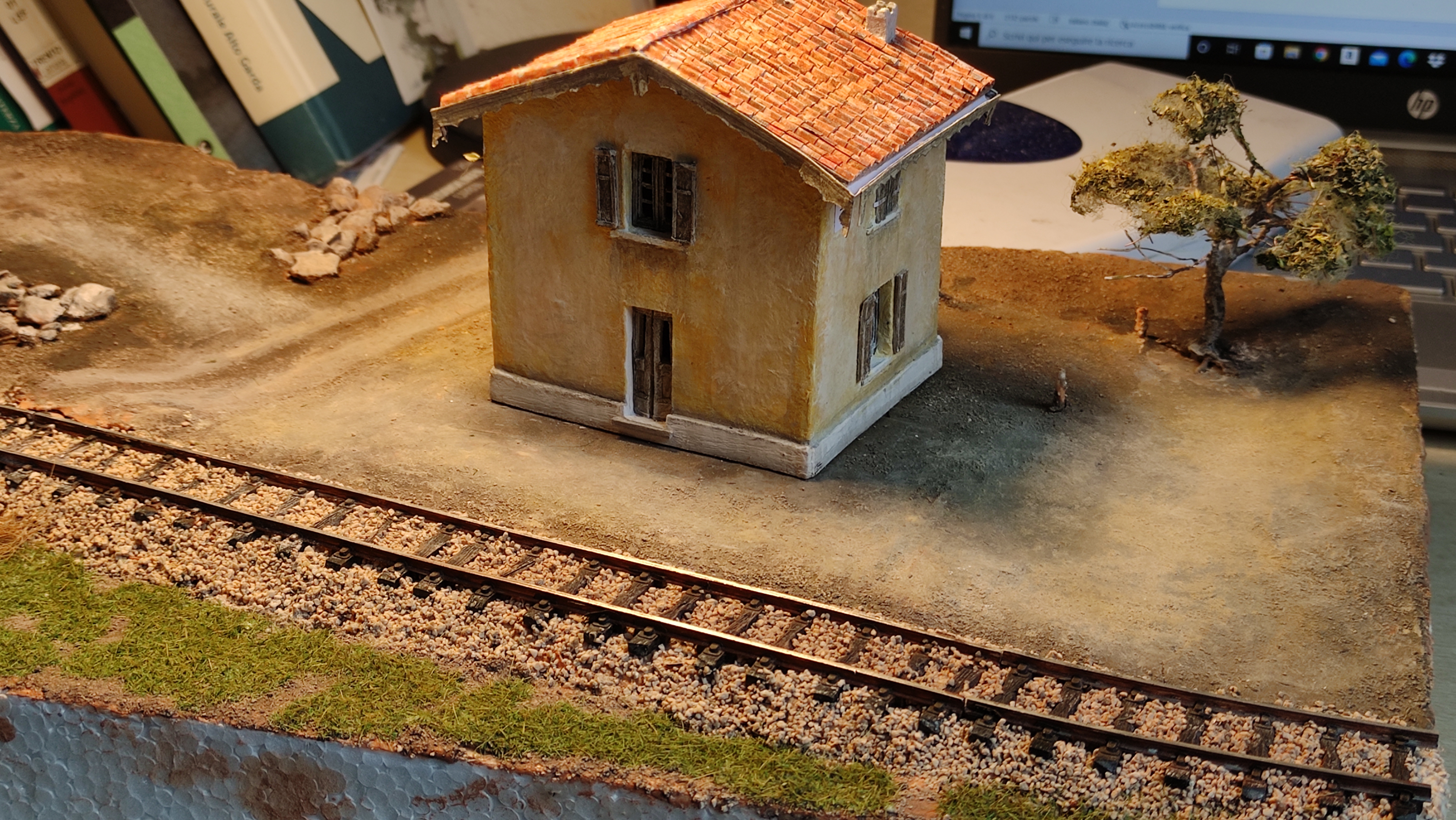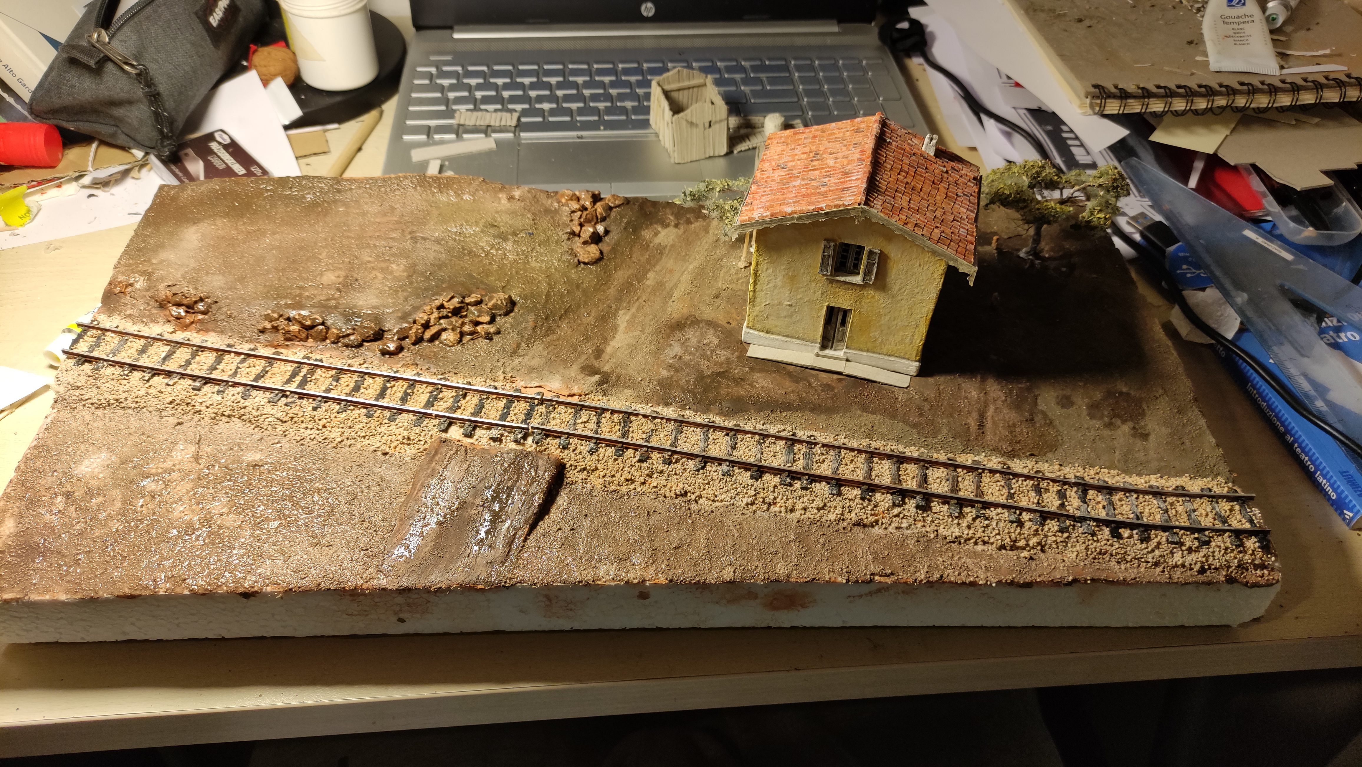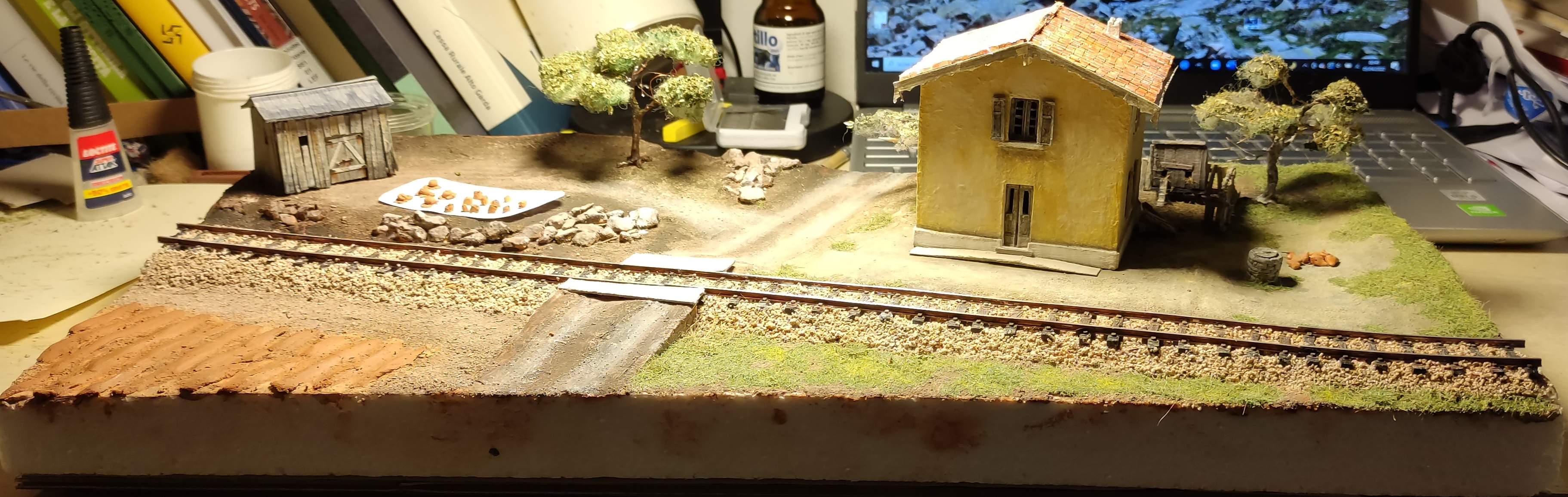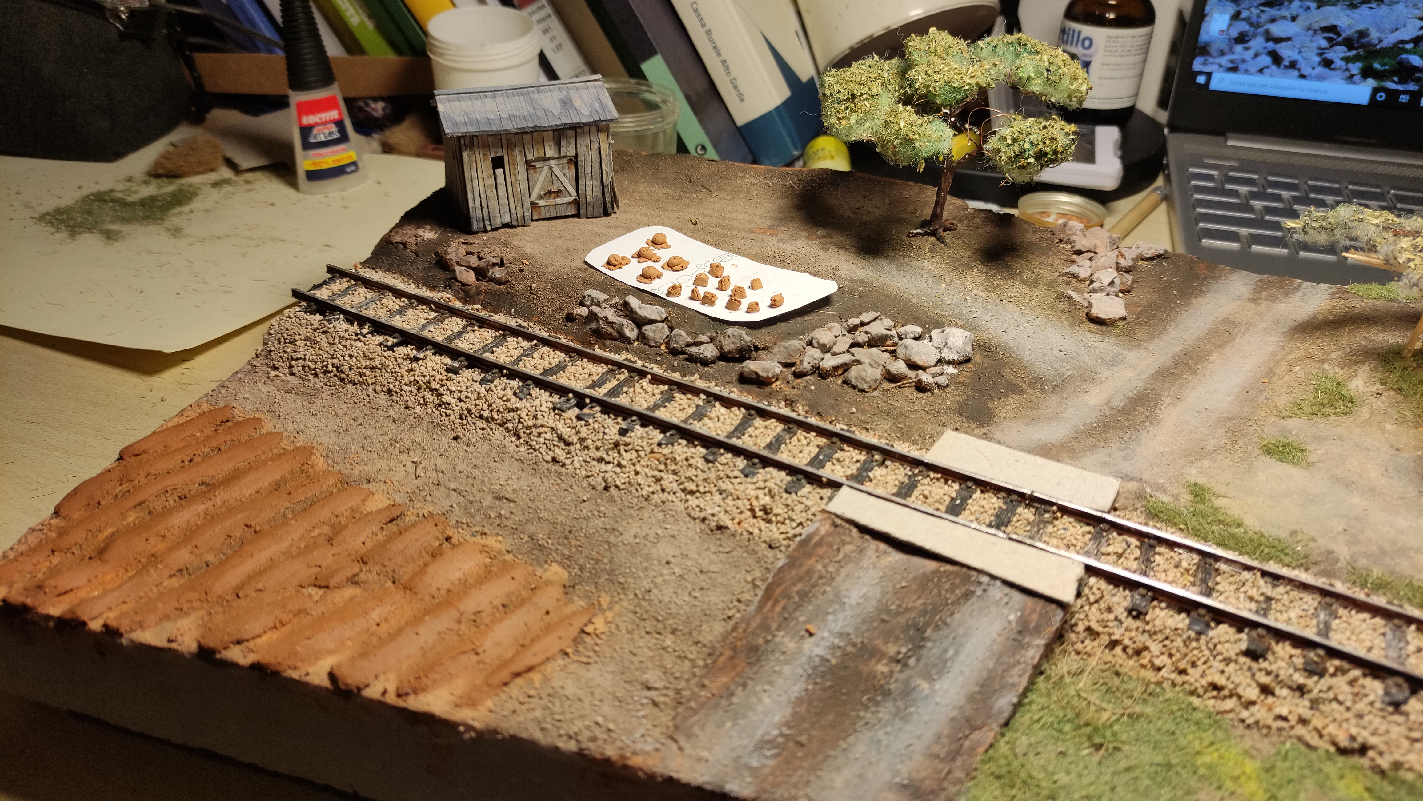 Breve aggiornamento notturno per dirvi che ho terminato la posa della massicciata (salvo ulteriori ritocchi) e sono andato avanti con il terreno, completando tutta la superficie del diorama e dando dappertutto la mano di fondo. Poi ho preparato l'alberello che ho piazzato vicino al casello, raccordandolo al terreno. Poi ho iniziato, con alcuni passaggi, a differenziare e schiarire il terreno.