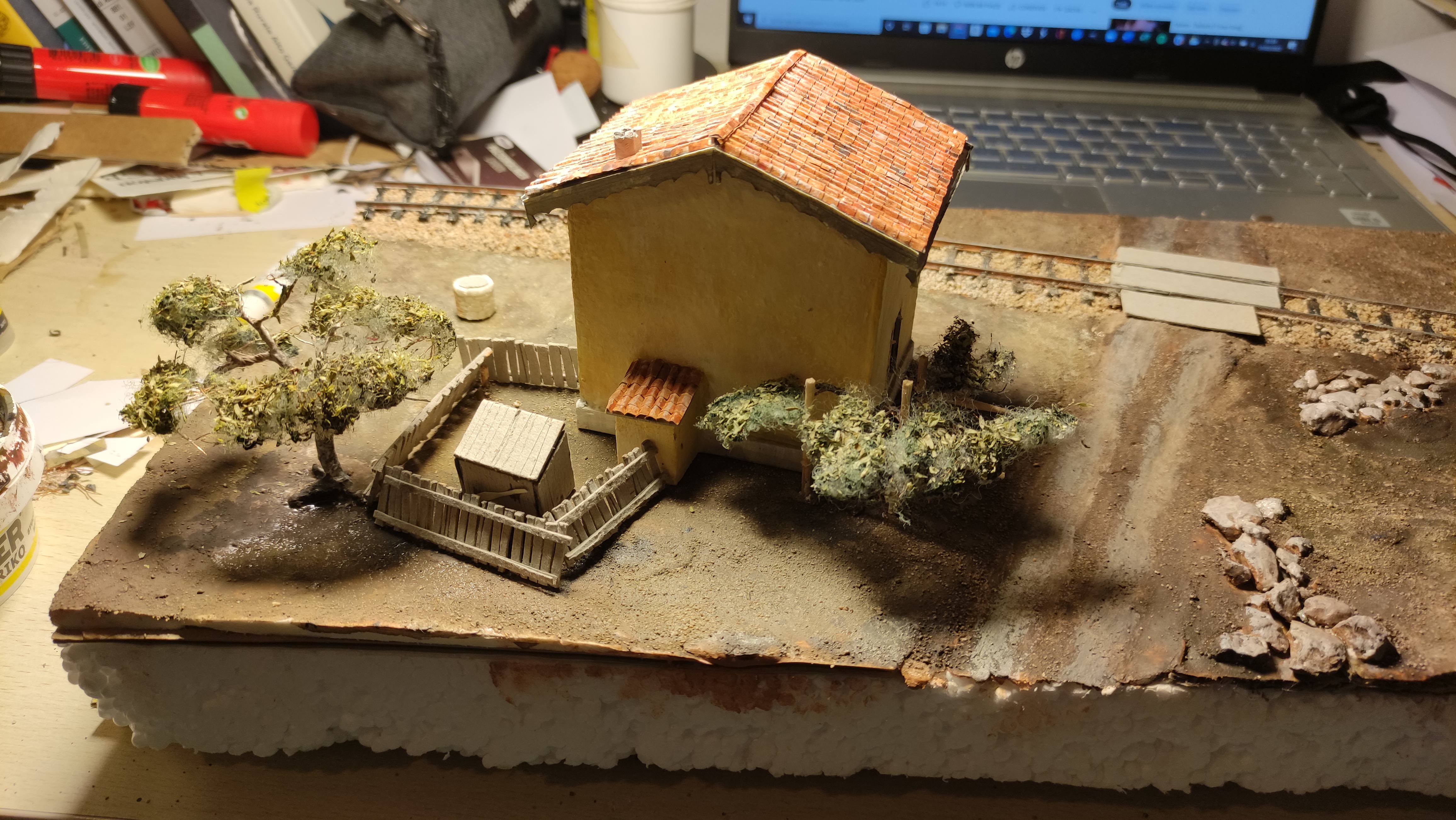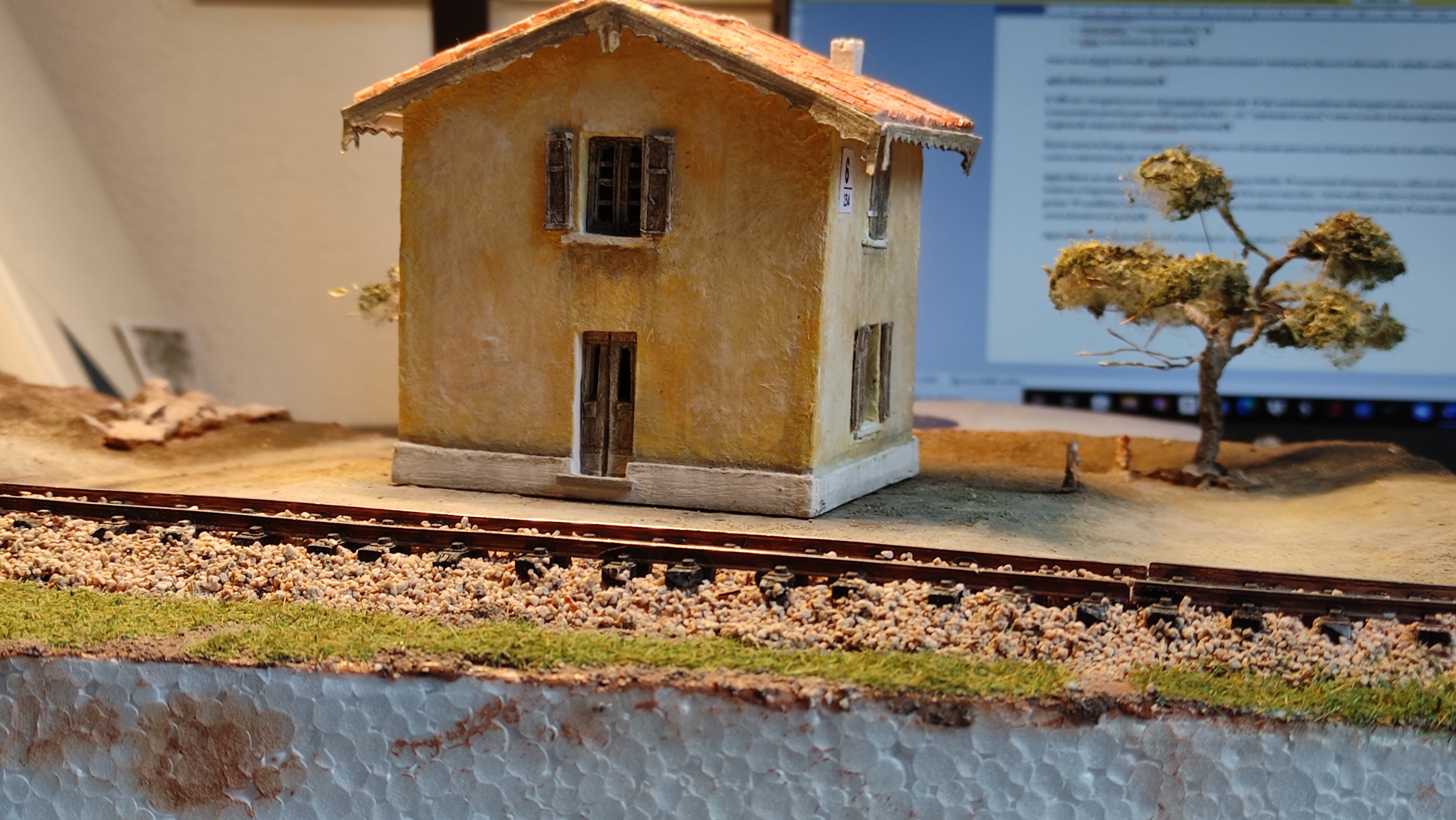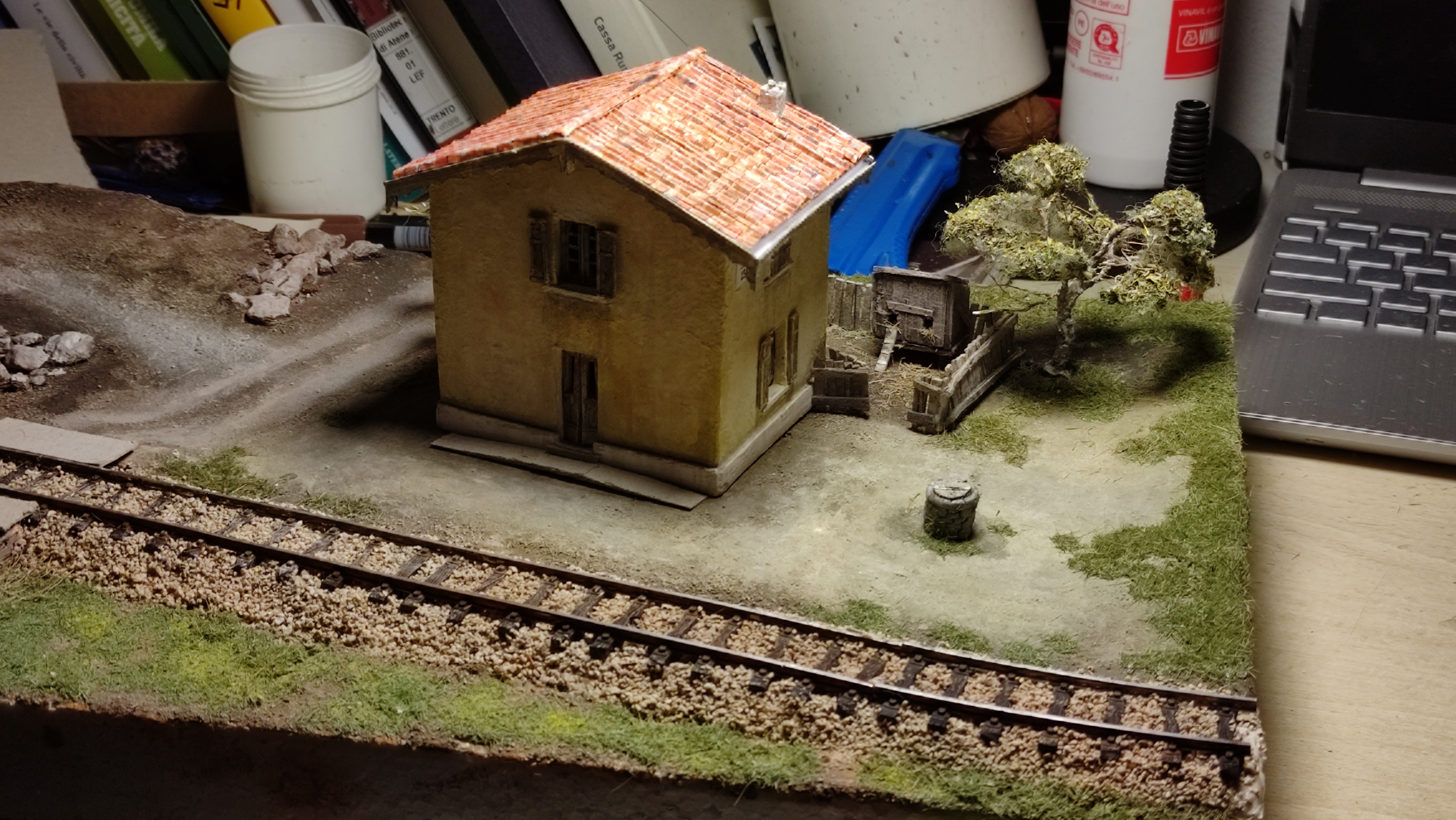 Breve aggiornamento notturno per dirvi che ho terminato la posa della massicciata (salvo ulteriori ritocchi) e sono andato avanti con il terreno, completando tutta la superficie del diorama e dando dappertutto la mano di fondo. Poi ho preparato l'alberello che ho piazzato vicino al casello, raccordandolo al terreno. Poi ho iniziato, con alcuni passaggi, a differenziare e schiarire il terreno.