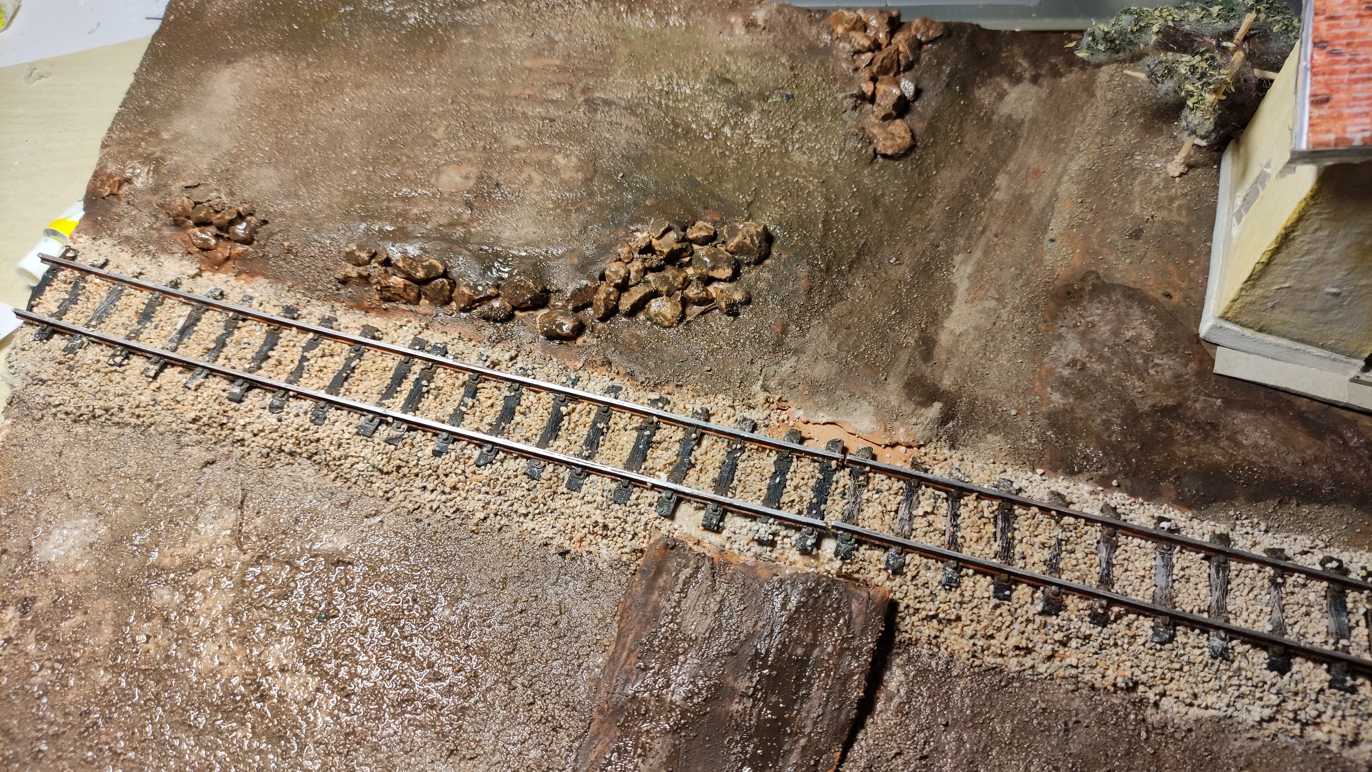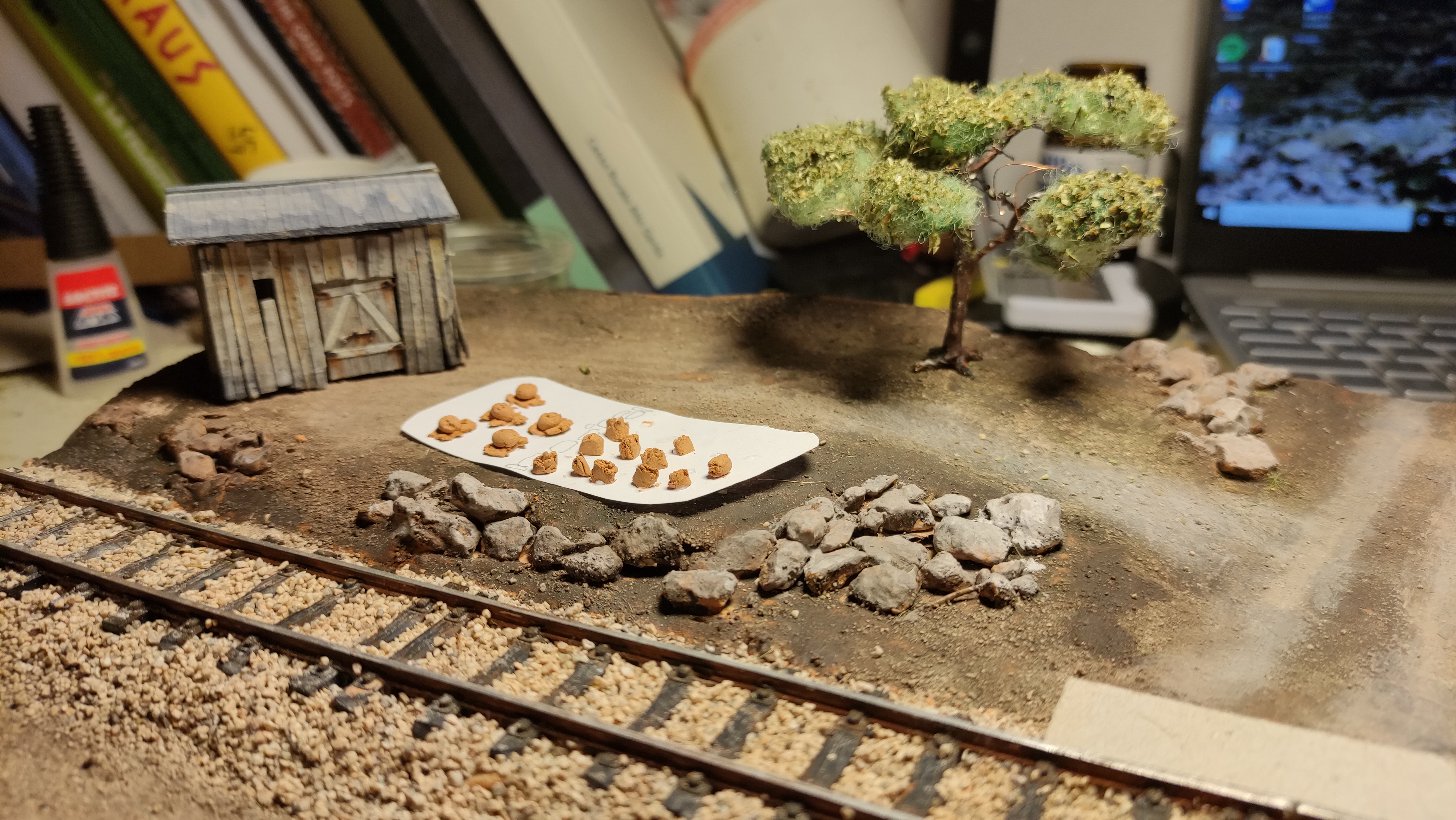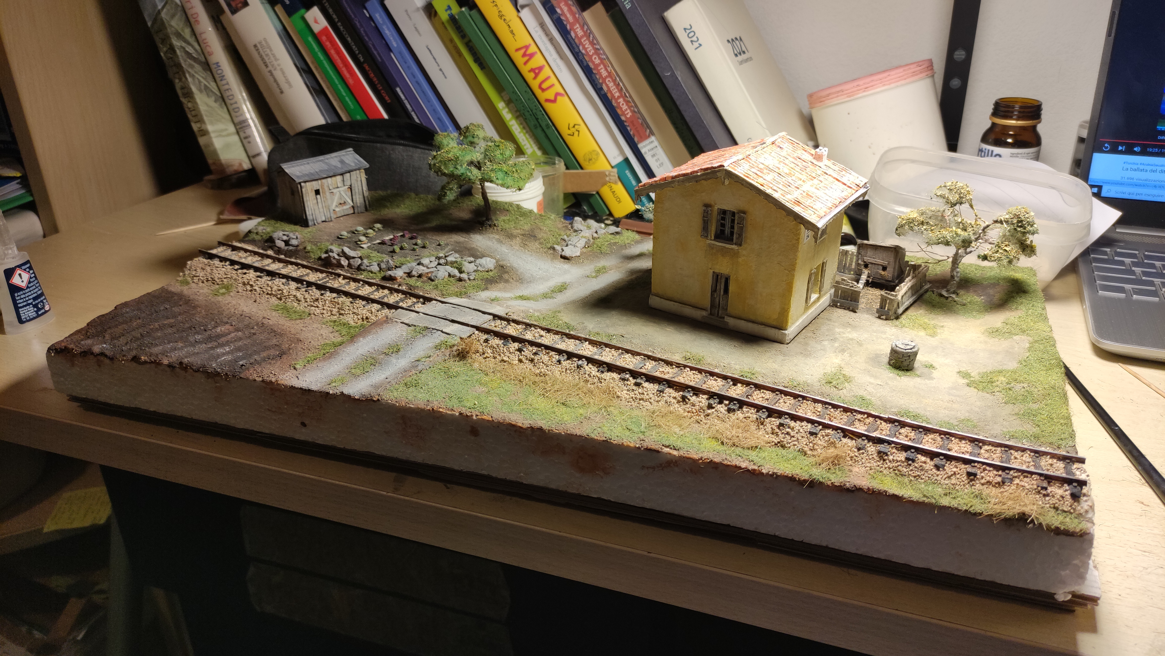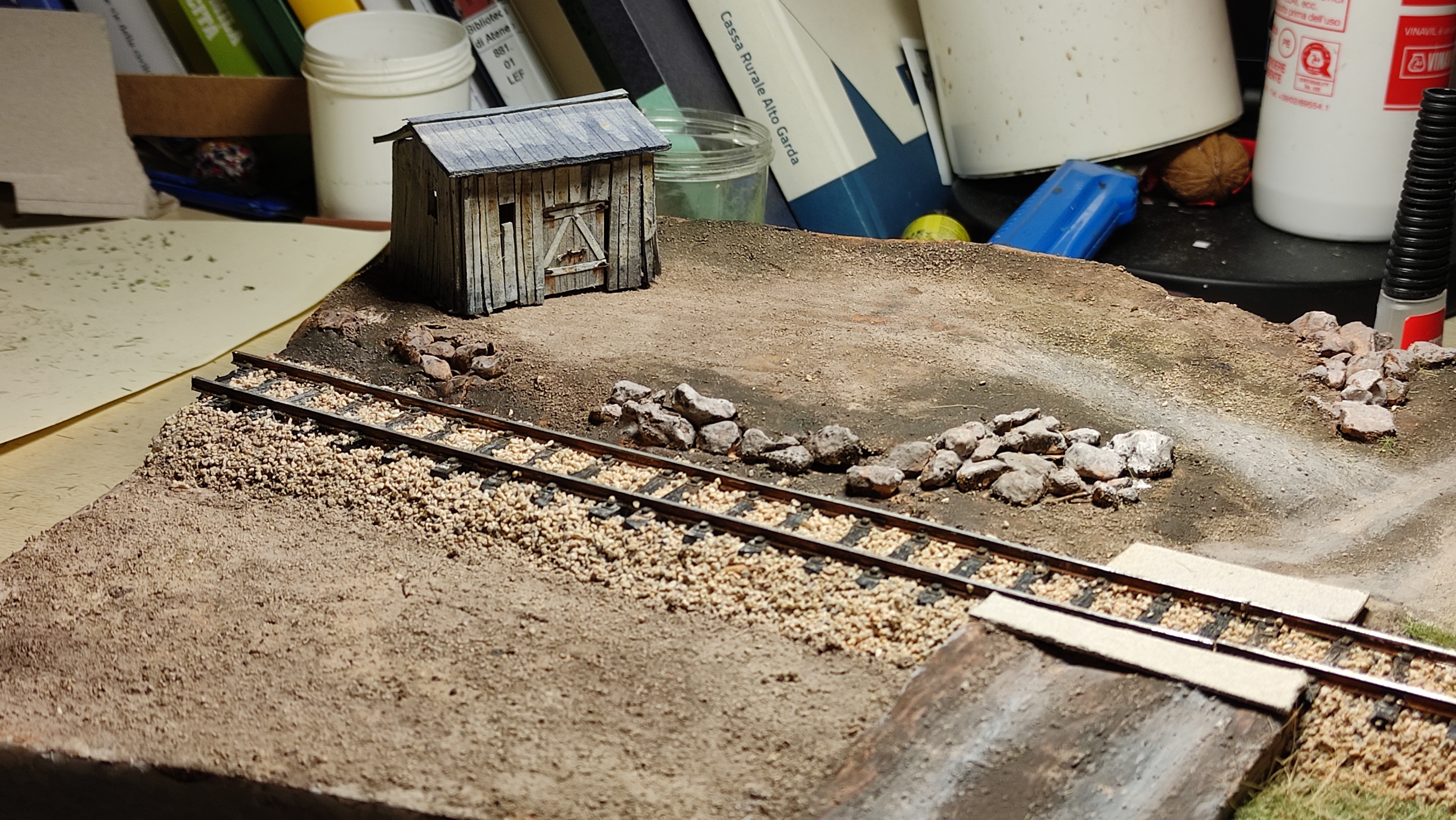 Breve aggiornamento notturno per dirvi che ho terminato la posa della massicciata (salvo ulteriori ritocchi) e sono andato avanti con il terreno, completando tutta la superficie del diorama e dando dappertutto la mano di fondo. Poi ho preparato l'alberello che ho piazzato vicino al casello, raccordandolo al terreno. Poi ho iniziato, con alcuni passaggi, a differenziare e schiarire il terreno.