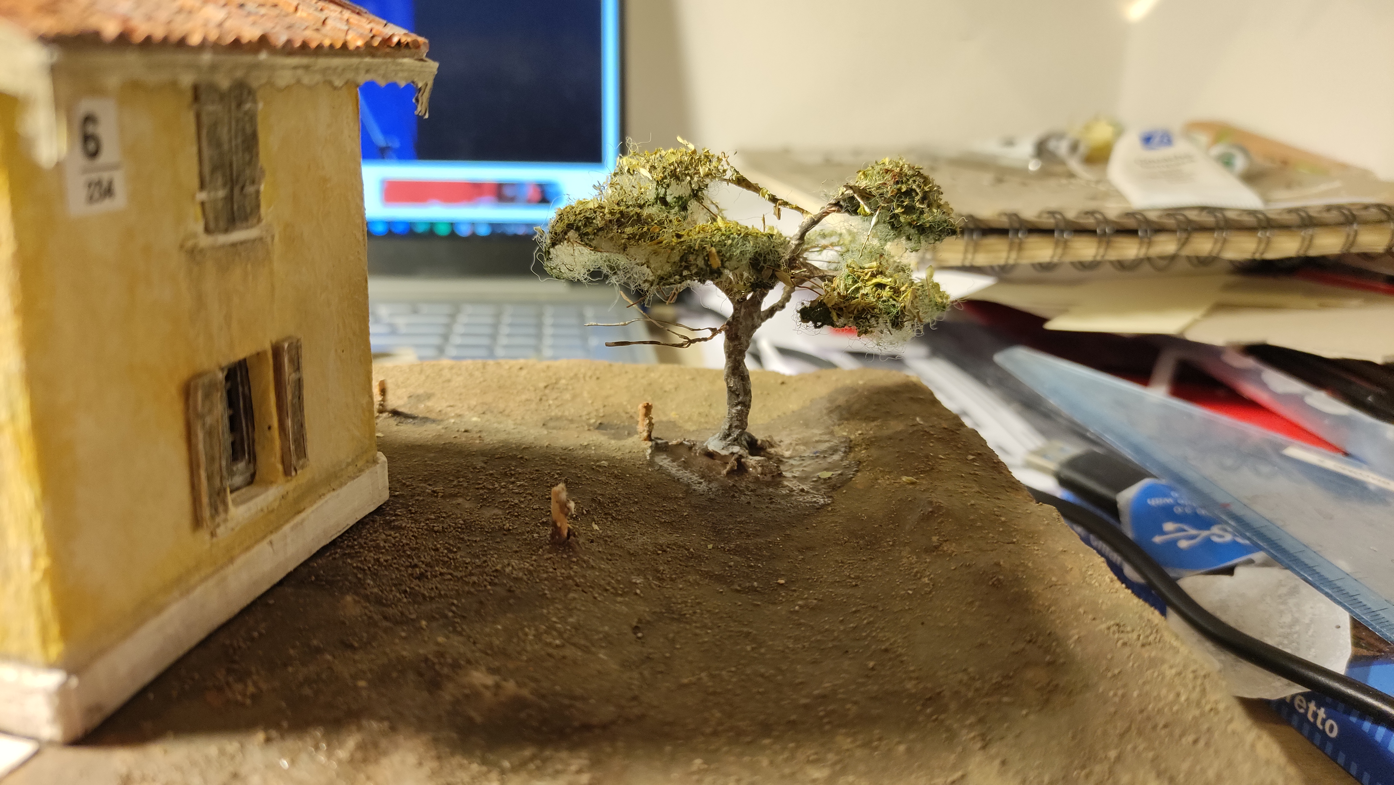 Infine ho preparato il campo dissodato in basso a sinistra e finito l'ultimo albero (spero) del diorama, da posizionare sempre nell'area dell'orto.