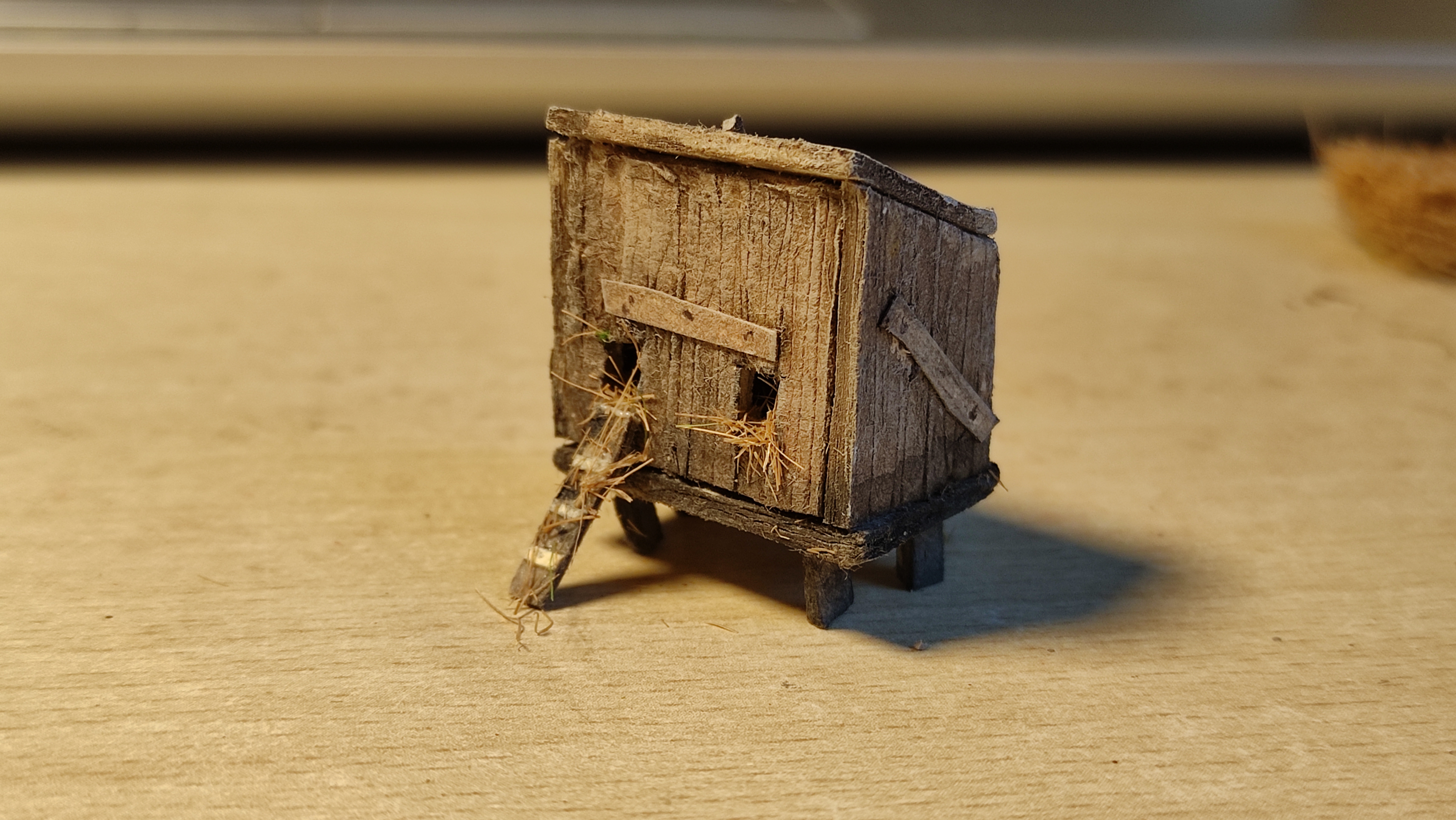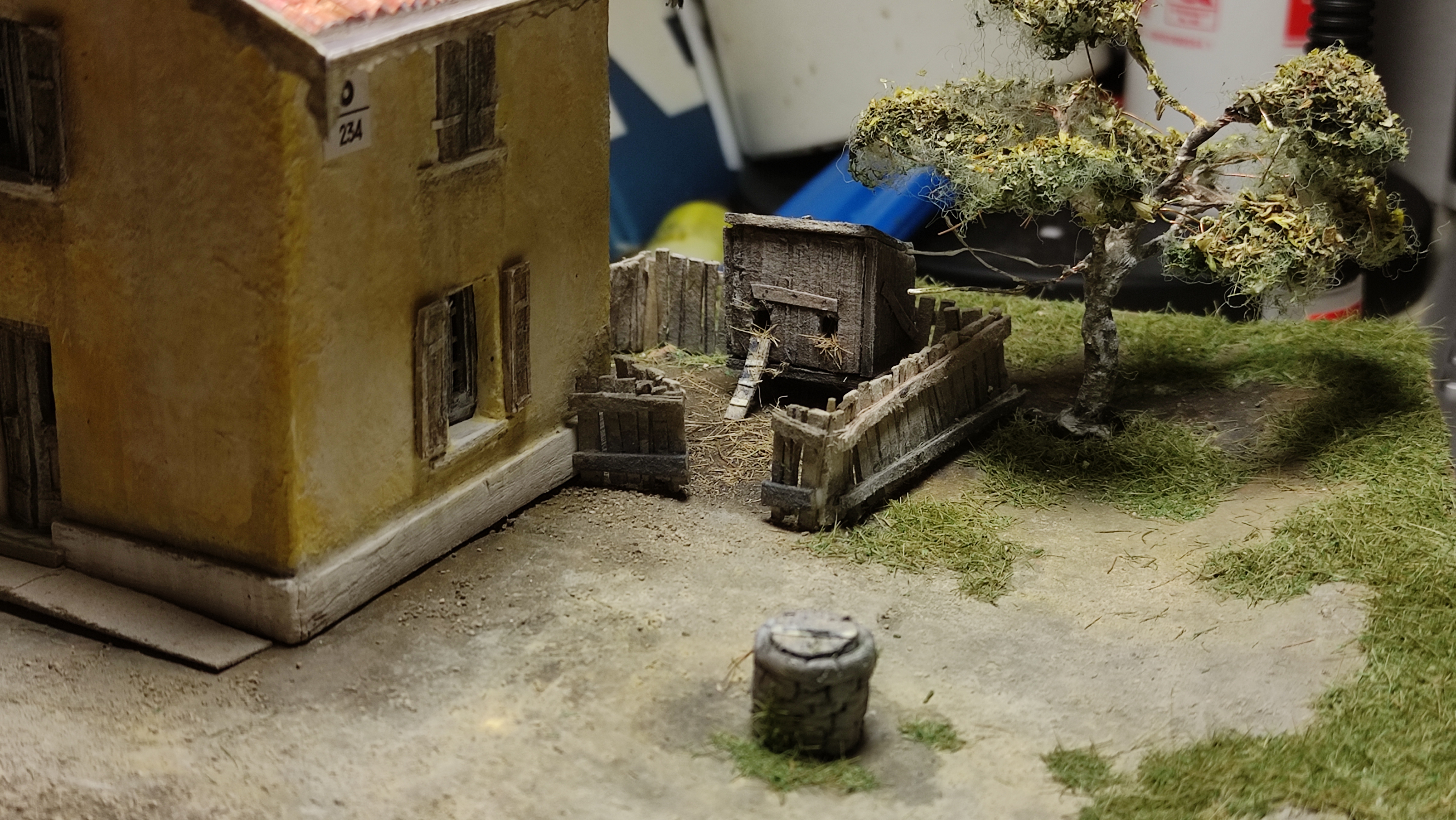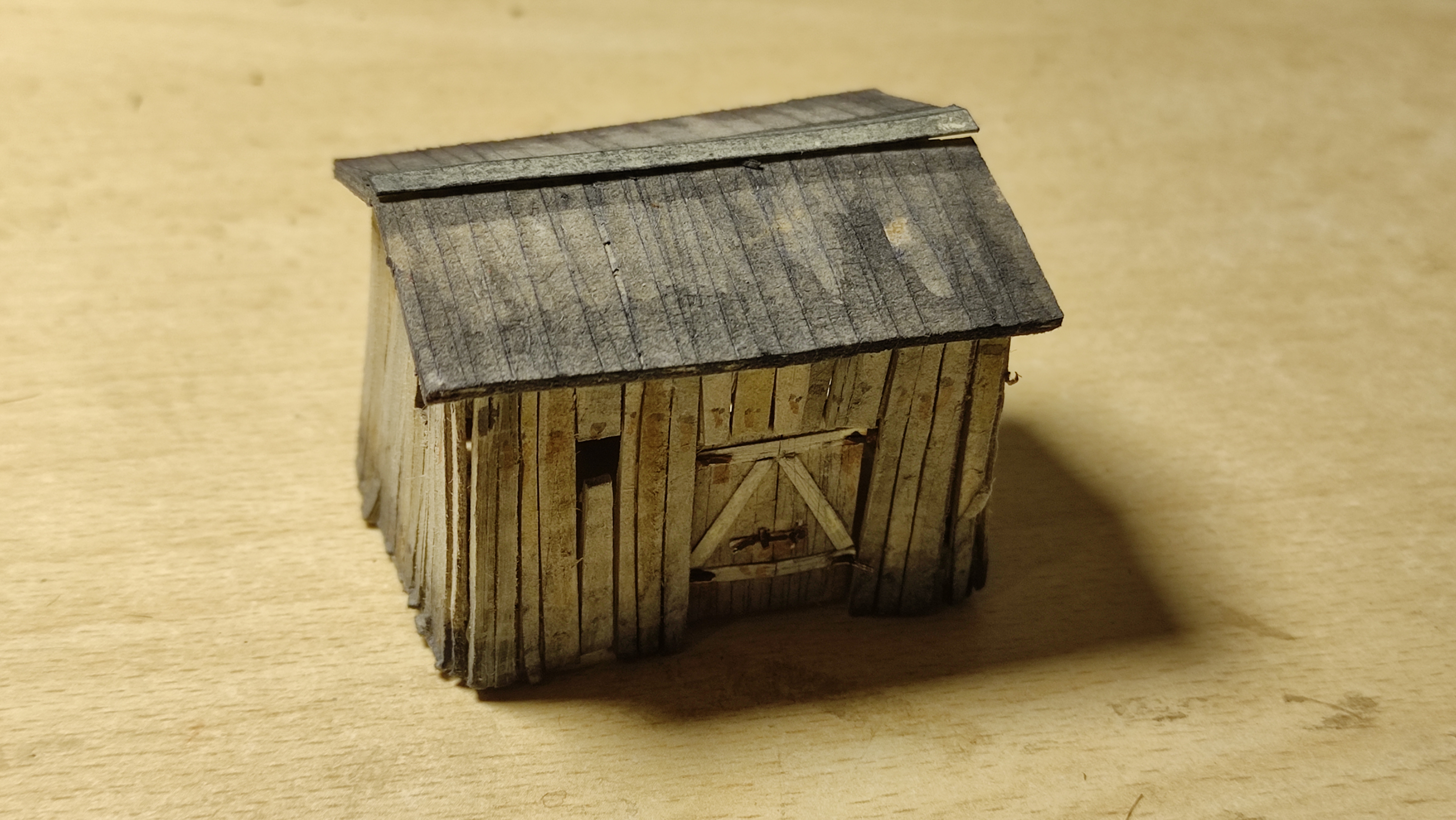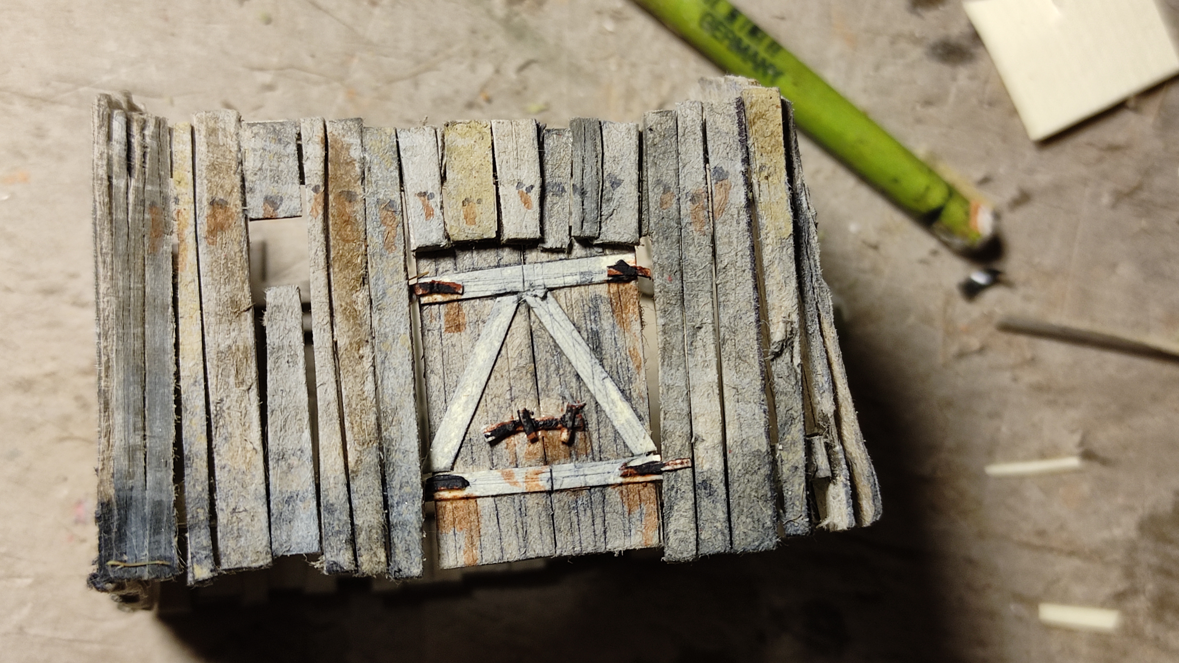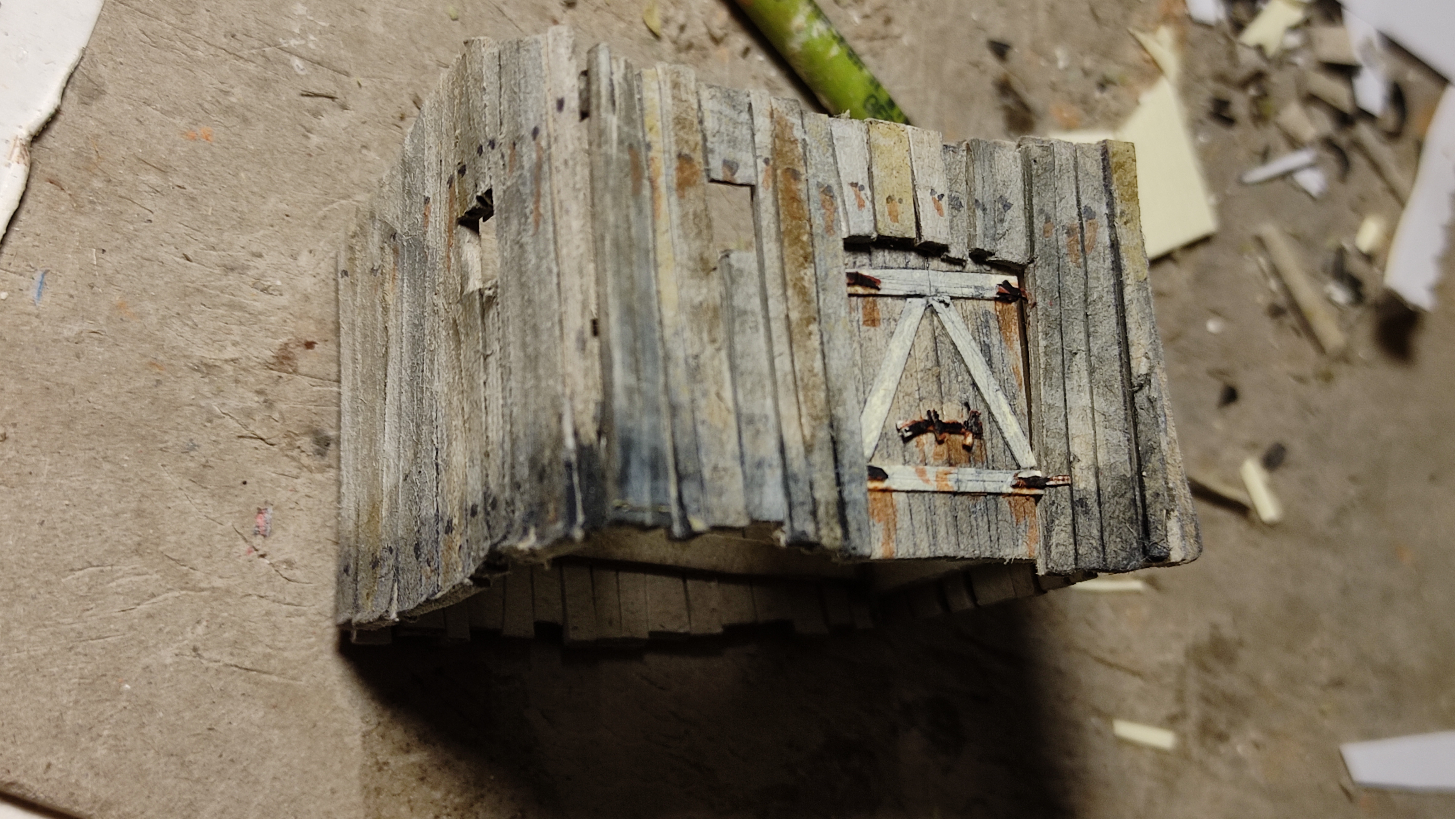 Poi mi sono concentrato sul capanno, che ho colorato, invecchiato e a cui ho applicato tetto e portone.