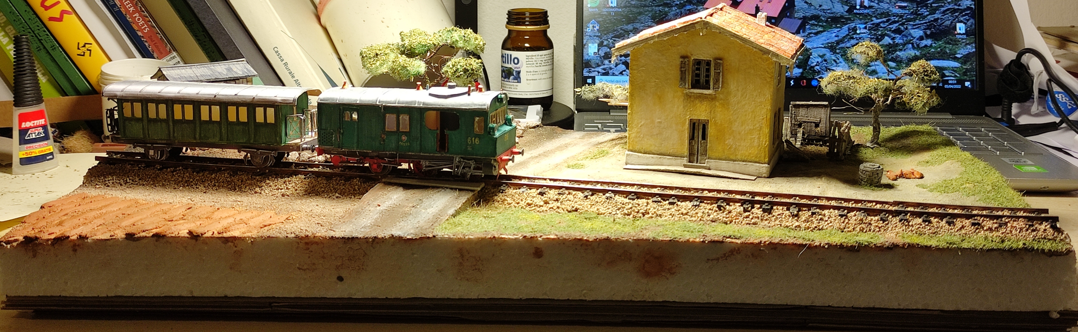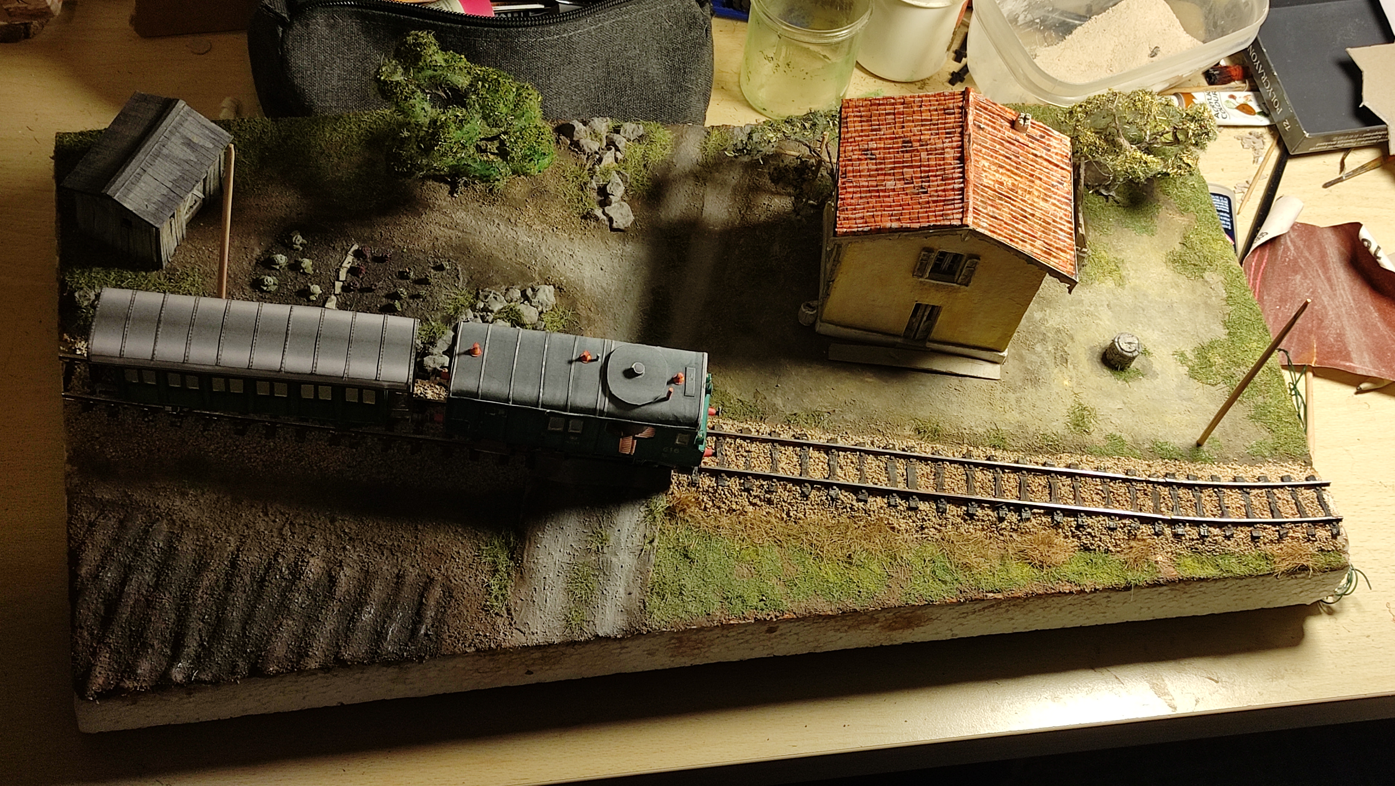 Ora devo finire la vegetazione, preparare tutti i piccoli dettagli che "animano" il diorama (galline ecc) e - ovviamente - terminare gli ultimi lavoretti sulla Gr. 60 e sulla carrozza, che ho lasciato in sospeso per dedicarmi al diorama.